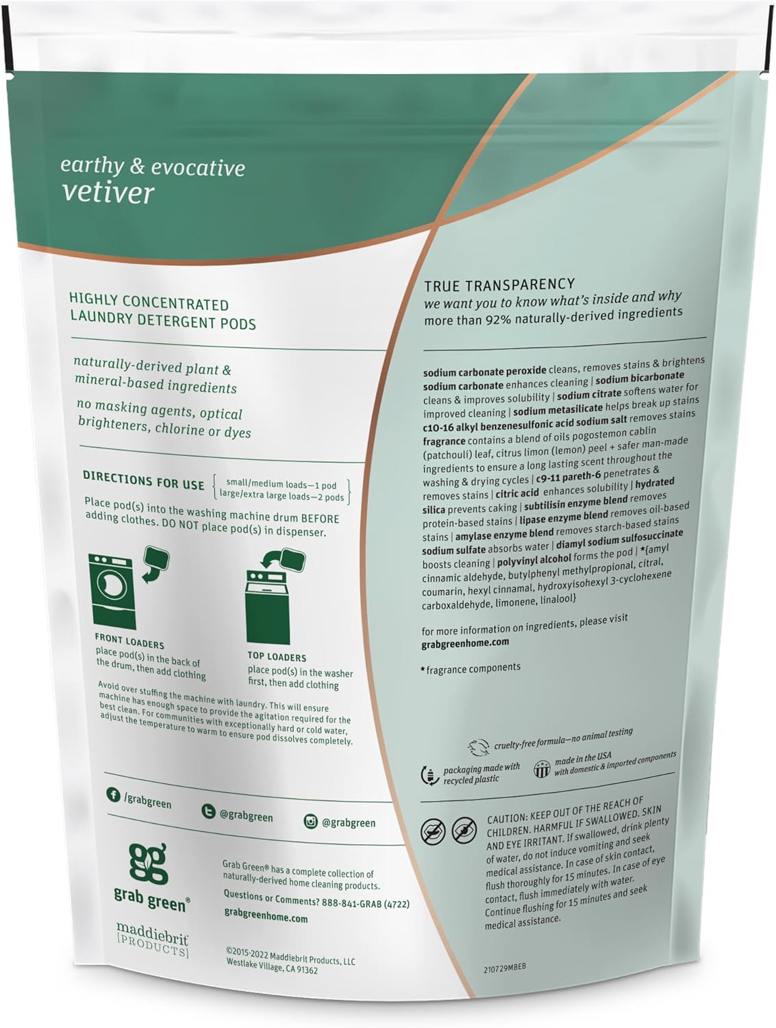 - Contains: 1- 24 Pod Bag of Grab Green Natural Vetiver 3in1 Laundry Detergent Pods. Our velcro closure bags are convenient and easy to use, no hassling with frustrating zip closures
