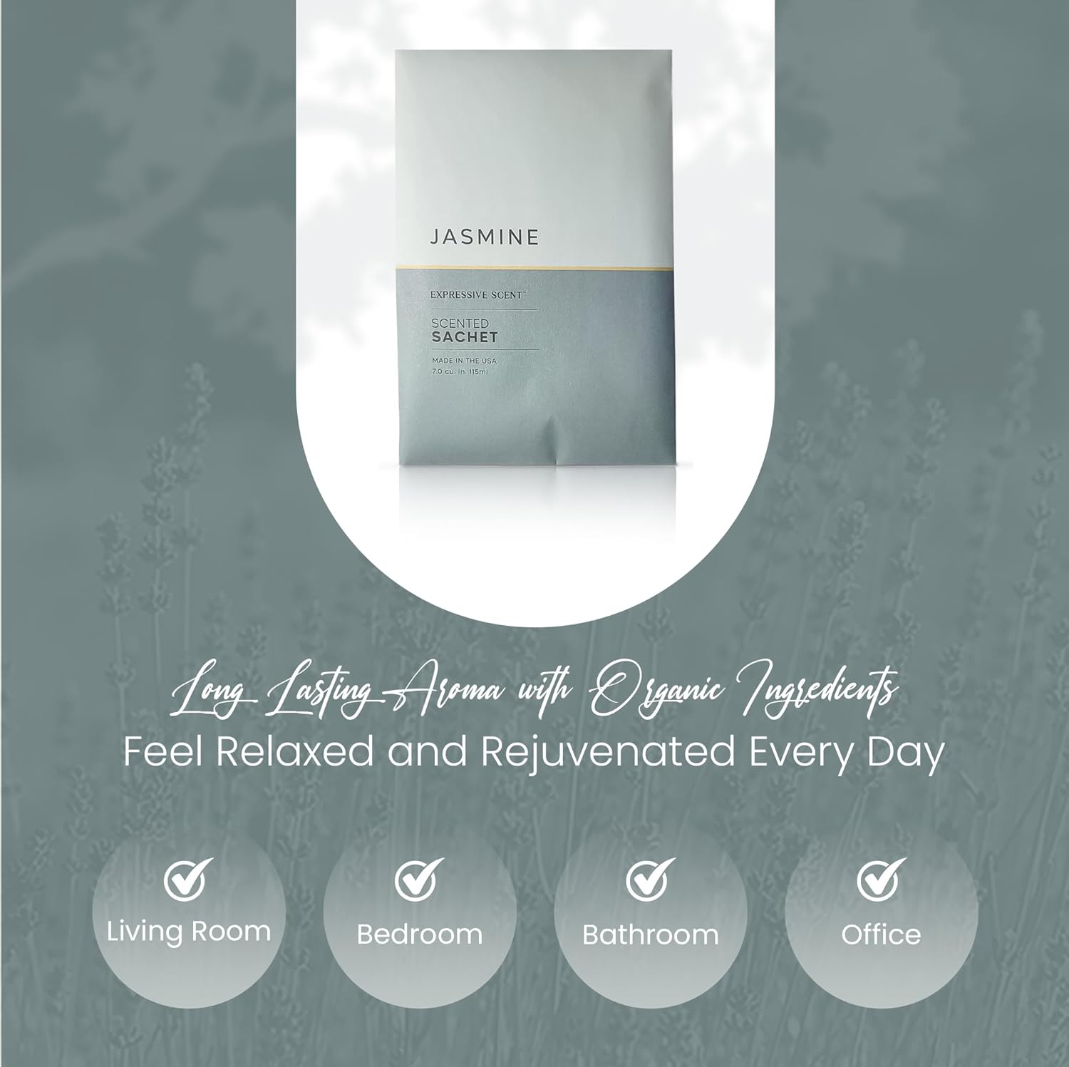 • PROUDLY MADE IN THE USA: Expressive Scent Sachet Pouches are crafted in the USA using only high-quality safe ingredients to ensuring a superior Jasmine Home Fragrance. Each order is carefully packaged to deliver the best experience. These versatile sachets can be used as Car Fresheners to eliminate stubborn odors, Room Fresheners for a burst of pleasant fragrance, Closet Deodorizers to keep clothes smelling fresh, or air fresheners throughout your home.