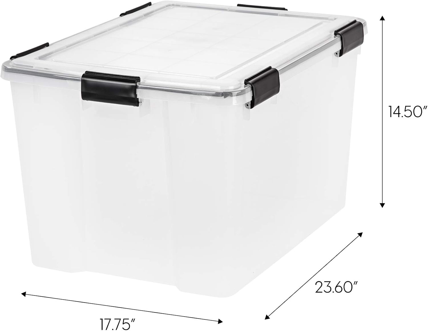 IRIS USA 4-Pack WeatherPro 74 Qt Clear Plastic Gasket Boxes with Latching Lids – Weathertight Heavy Duty Stackable Storage Containers for Clothes, Food, Tools or Camping Gear