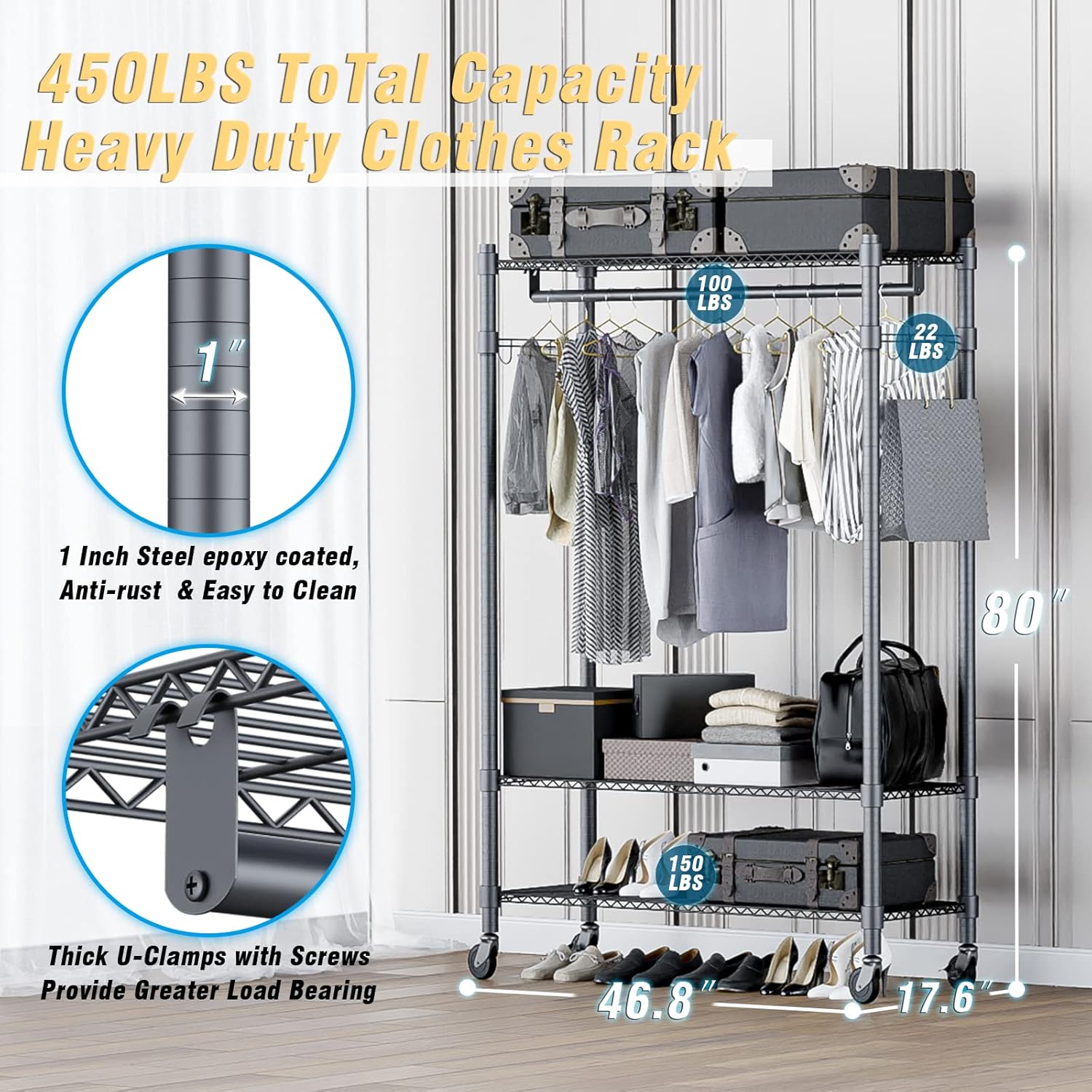 Homdox Rolling Clothes Rack Heavy Duty, 3-Tier Adjustable Wire Shelving Garment Organizer with Double Rods & Hooks, Portable Clothes Rack with Wheels, 17.72" D x 47.24" W x 80.71" H, Grey