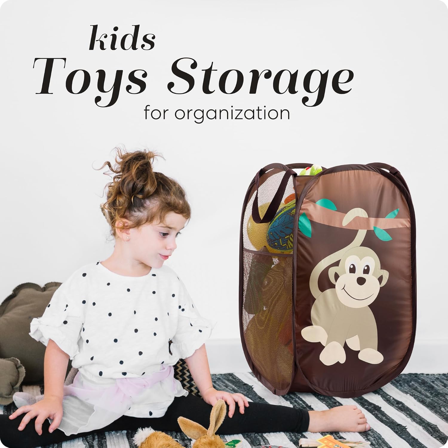 Handy Laundry Collapsible Mesh Pop Up Hamper with Wide Opening and Side Pocket - Breathable, Sturdy, Foldable, and Space-Saving Design for Clothes and Storage (Monkey)
