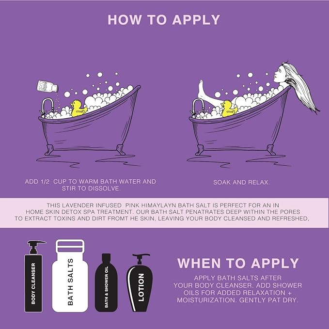 - PINK HIMALAYAN BATH SALTS: This calming salt blend softens and rejuvenates all bodies. Filled with hand - harvested salt crystals from the Southern Dead Sea, soak contains nourishing vitamins and minerals like magnesium, potassium, sulfur, zinc and more.