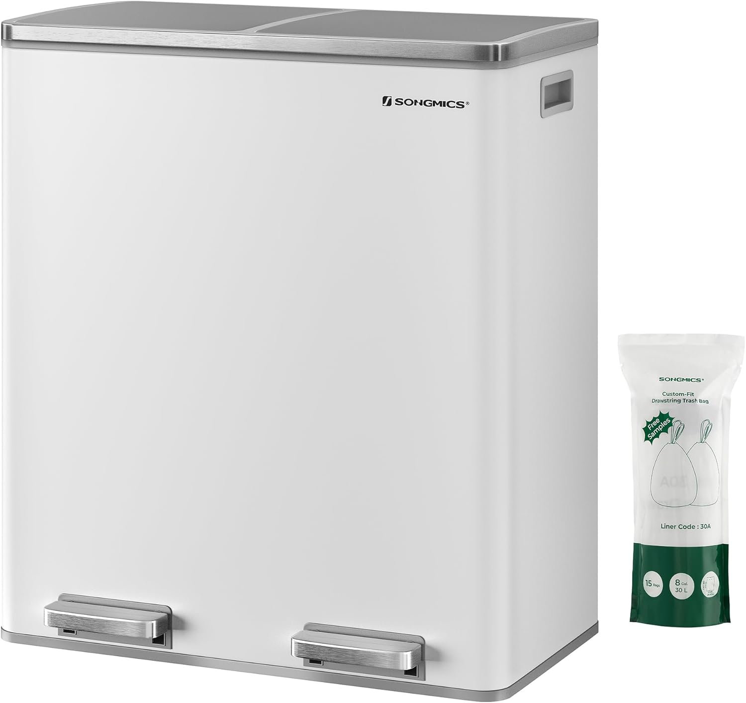 SONGMICS Trash Can, 2 x 8 Gallon (2 x 30 L) Garbage Can for Kitchen, with 15 Trash Bags, 2 Compartments, Plastic Inner Buckets and Hinged Lids, Airtight, White and Gray ULTB60WT