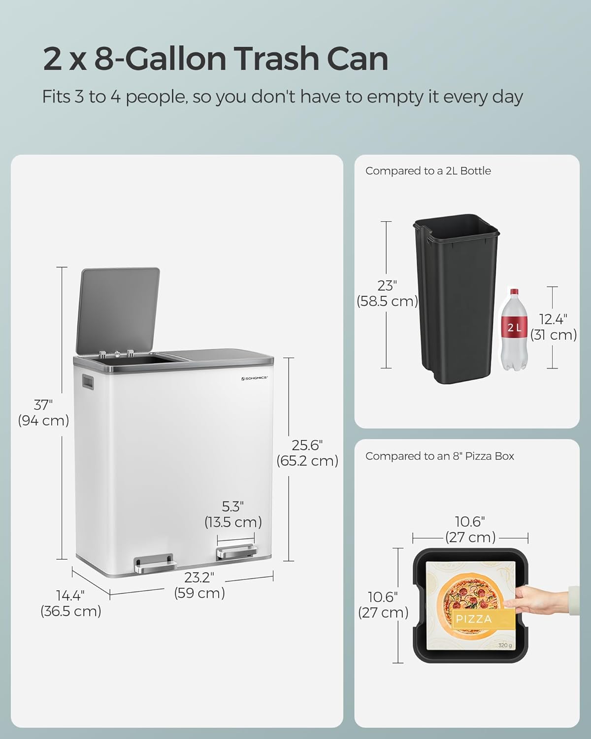 - [What You Get] A dual trash can sized at 23.2”L x 14.4”W x 25.6”H with 2 x 10.6-gallon compartments, 15 trash bags, plastic inner buckets, and a soft closure mechanism for easy waste disposal
