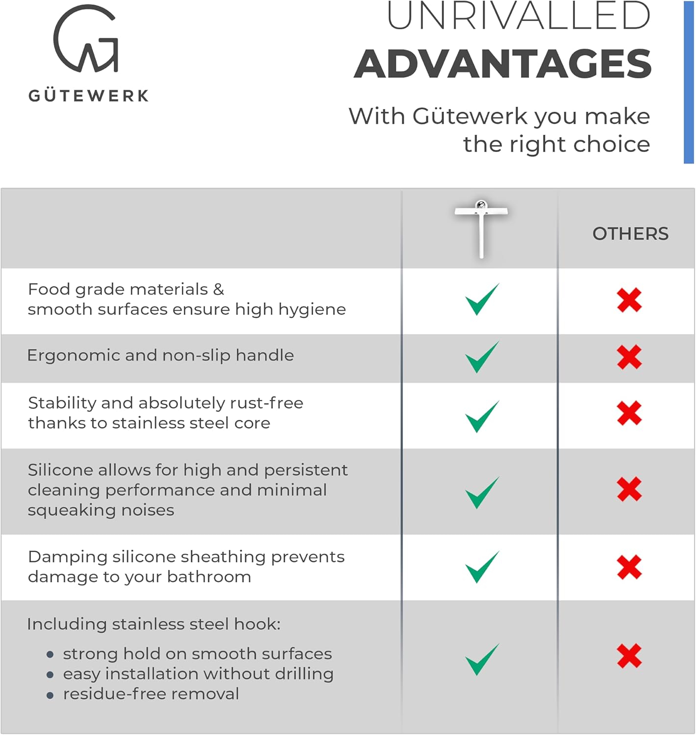 - MINIMALIST TIMELESS DESIGN - The GÜTEWERK glass squeegee is crafted with a matte white finish that impresses with its elegant timeless and smart design. In addition, the chrome-colored stainless-steel hook integrates well with any modern bathroom.