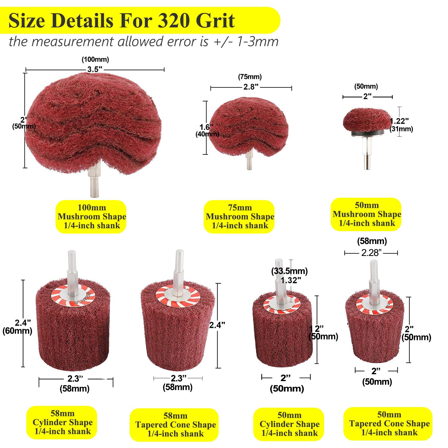 - [Elastic Abrasive Buffing Wheels Set]: These 7-pcs non-woven abrasive drill attachments is designed with an assortment of shapes and sizes, and with high flexibility, self-sharpening, high grinding efficiency, good heat dissipation.