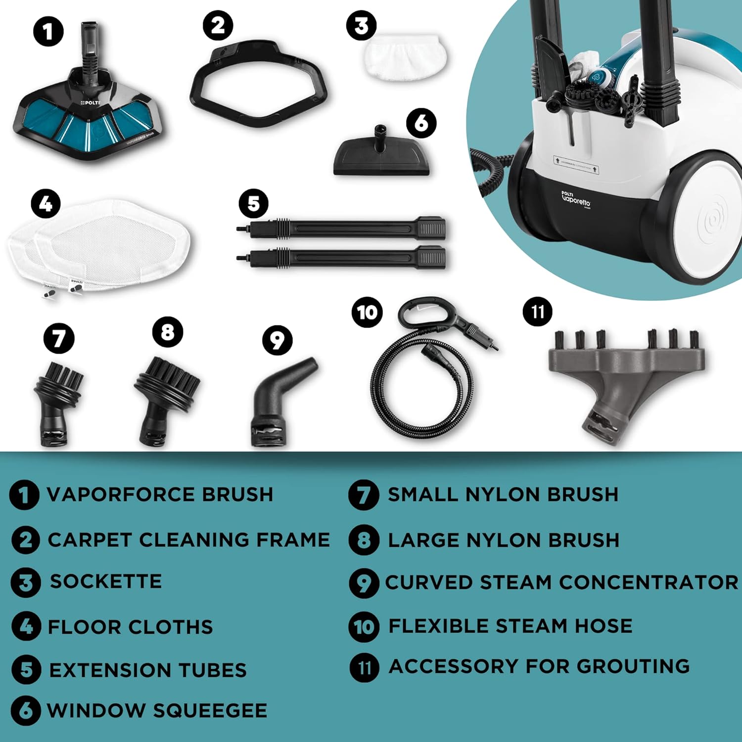 POLTI Vaporetto Smart 100 Steam Cleaner with Unlimited Steam Technology, Sanitize Floors, Carpets and Surfaces Adjustable High Power Steam Pressure Up to 58 PSI with 10 Accessories 1 Year Warranty