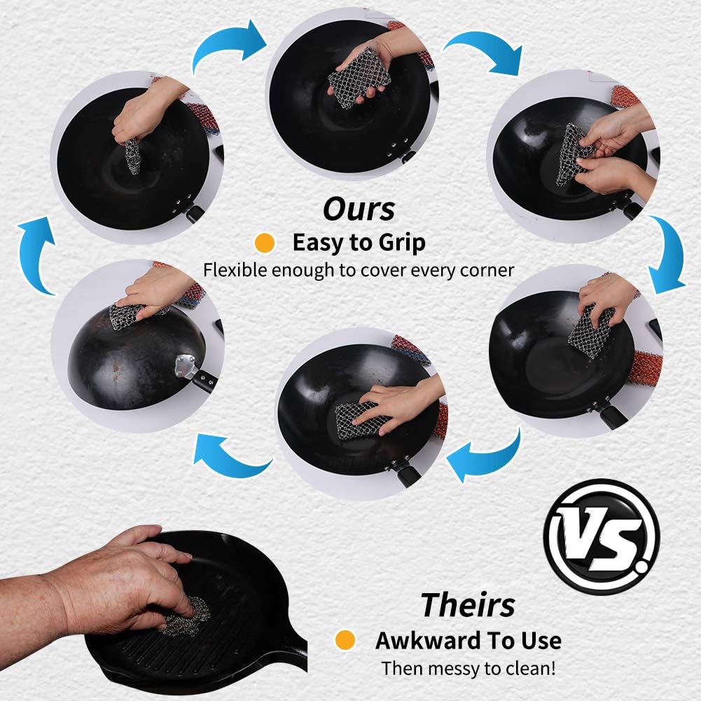 - 【How to clean a skillet?】Scrub the cast iron, skillet,and other stubbon built up,grease under warm water, rinses with clean water then let it dry. Convenient hanging ring on this cast iron pan cleaner chainmail scrubber allow easy storage. 6 Colors available.