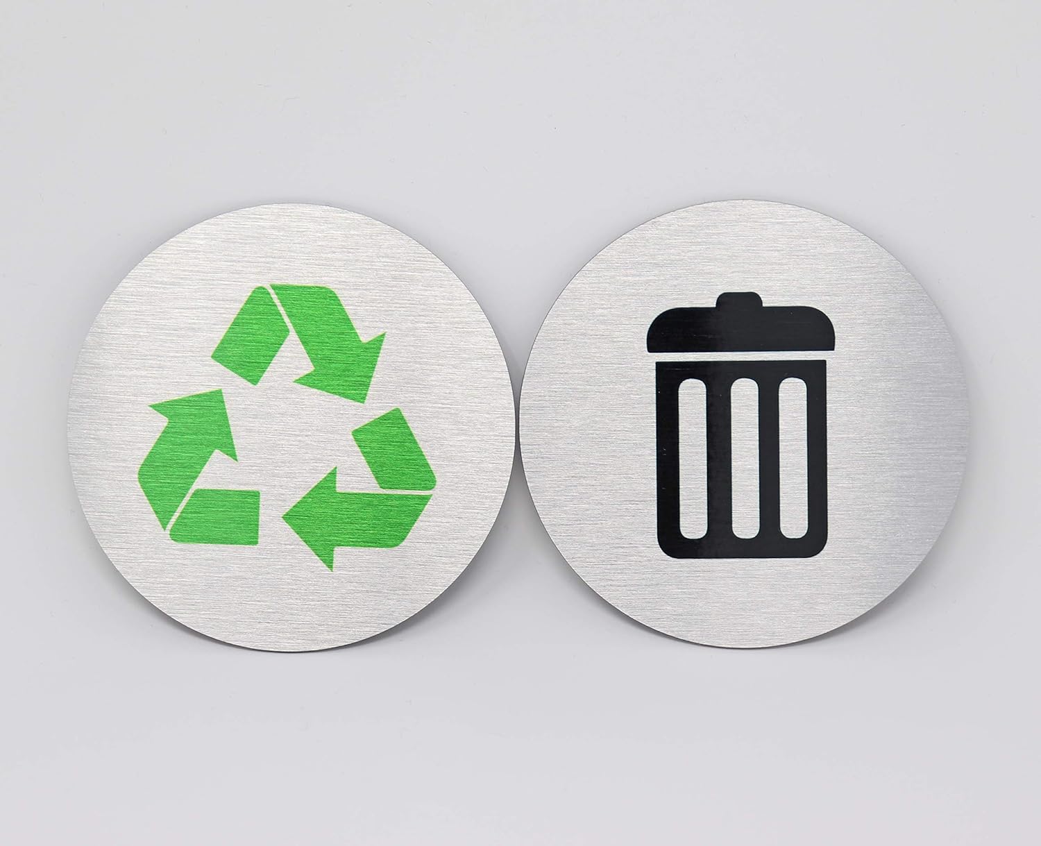 - UNBEATABLE VALUE - Our 3” round, brushed silver aluminum signs are designed for long lasting quality in the kitchen, office, or at home. These high-grade INDOOR trash and recycling signs provide an affordable and durable option that will outlast any sticker alternative.