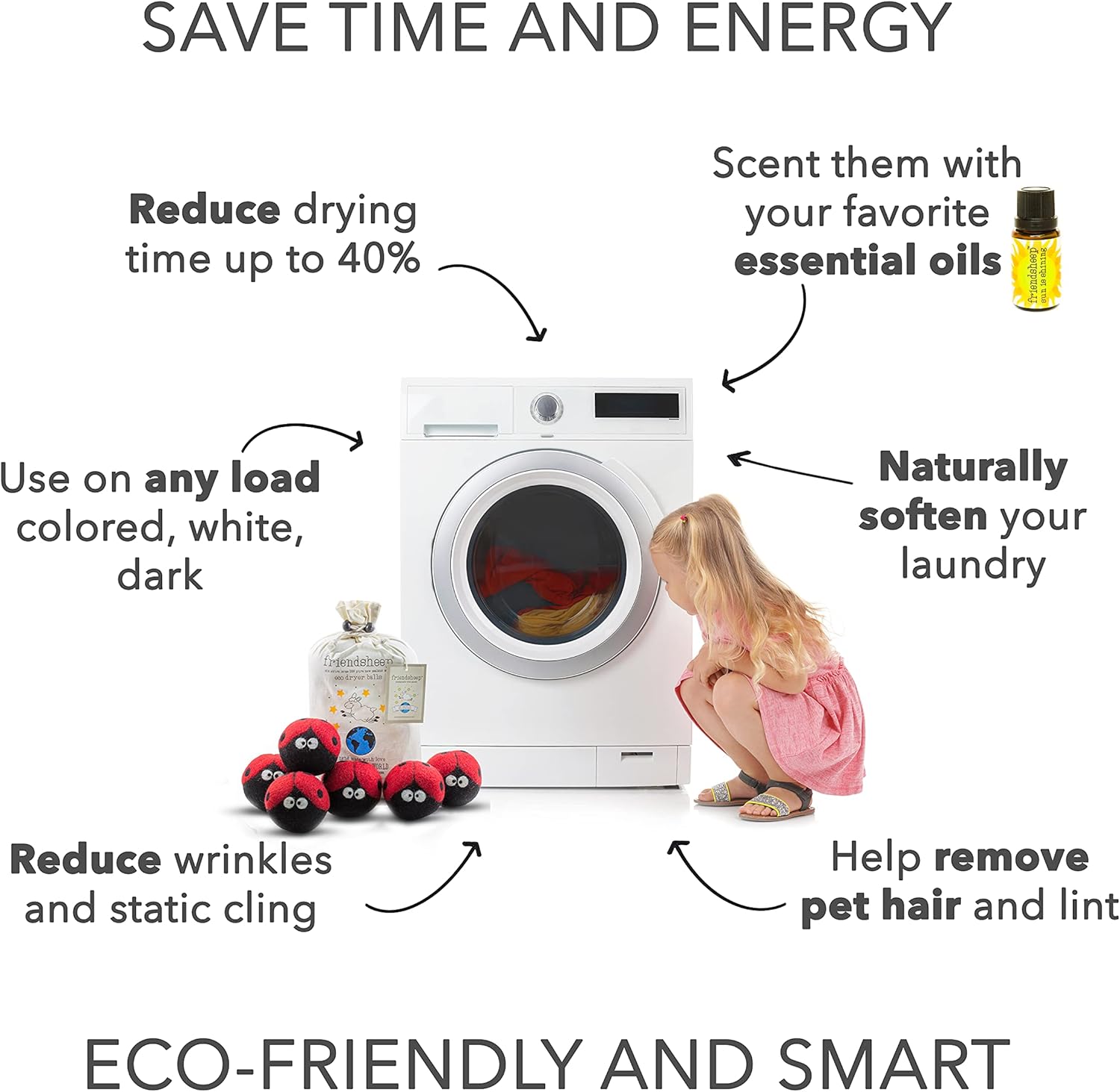 Friendsheep Wool Dryer Balls 6 Pack XL Organic Premium Reusable Cruelty Free Handmade Fair Trade No Lint Fabric Softener Ladybugs - Laundrybugs