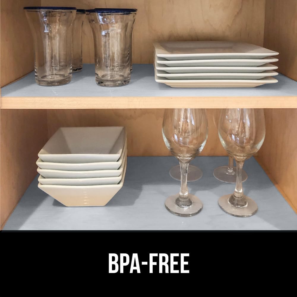 - STRONG GRIP: the Gorilla Grip DuraGuard shelf liner is a durable non adhesive liner designed to stay firmly in place on shelves, drawers and cabinets; will also help keep your items in place; they help to prevent dishware and other fragile items from shifting; designed to help reduce slipping and bunching in your drawers and cabinets