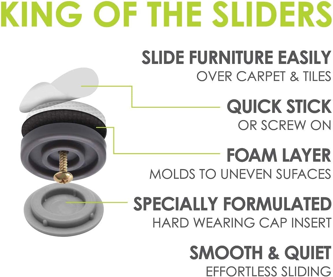 - Screw on self-stick attachment sliders - Includes 16 x 1 inch round plastic chair glides with 7/8” insert slider caps. These premium furniture glides feature self adhesive backings for quick attachment and 16 screws for secure attachment. If sliding on carpet, decking, tile, or rough floor surfaces GorillaGlides must be screwed into furniture with the included installation hardware.