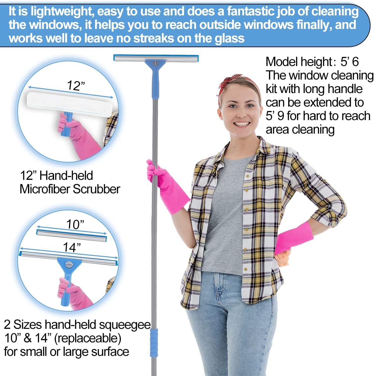 - Premium Quality - The professionally designed window cleaning squeegee kit is super sturdy and easy to use. It can be a handheld window washer or a window squeegee to clean any flat surface. Also, it can reach to 69 inches high when attaching to our super strong extendable steel long handle, it does help you to wash indoor and outdoor high window safely without a ladder. The extra squeegee blade and microfiber pads will make this window washing kit to work stable and lasting long.