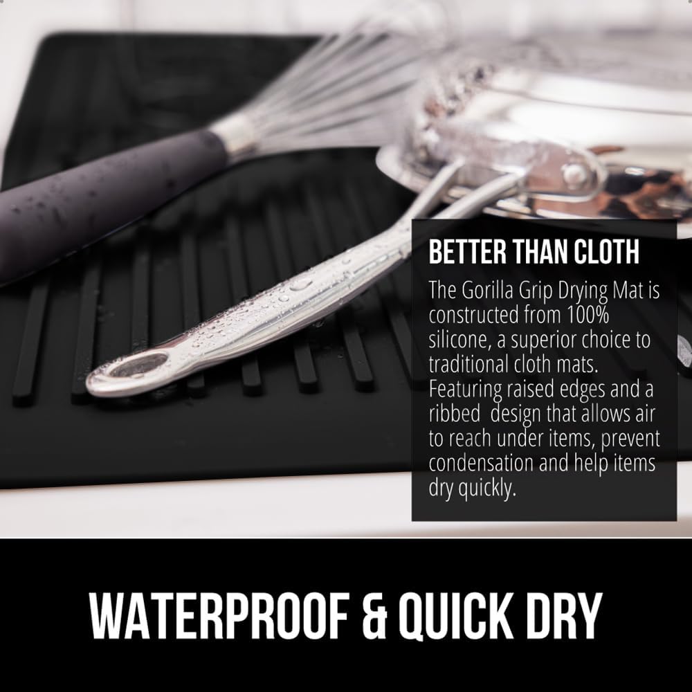 GORILLA GRIP 100% BPA-Free Patented Silicone Dish Drying Mat for Kitchen Counter, 18x24 Inch, Water Catching Ribbed Design, Easy Clean Waterproof Sink Liner, Heat Resistant, Fits Under Rack, Black