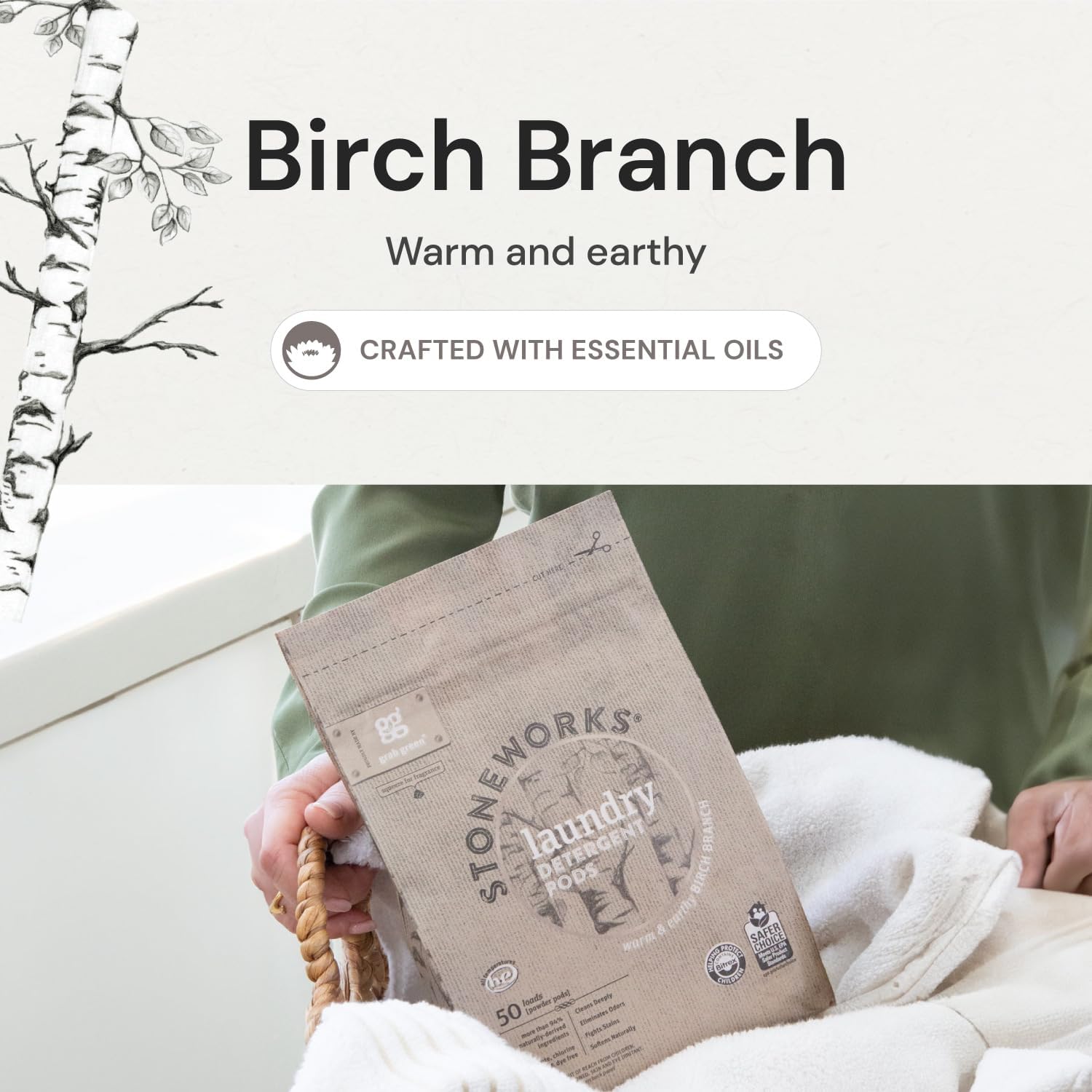 - Contains: 1- 50 Pod Bag of Grab Green Stoneworks Birch Branch Laundry Detergent Pods and 1- 80 Sheet Box of Grab Green Stoneworks Natural, Compostable Birch Branch Dryer Sheets