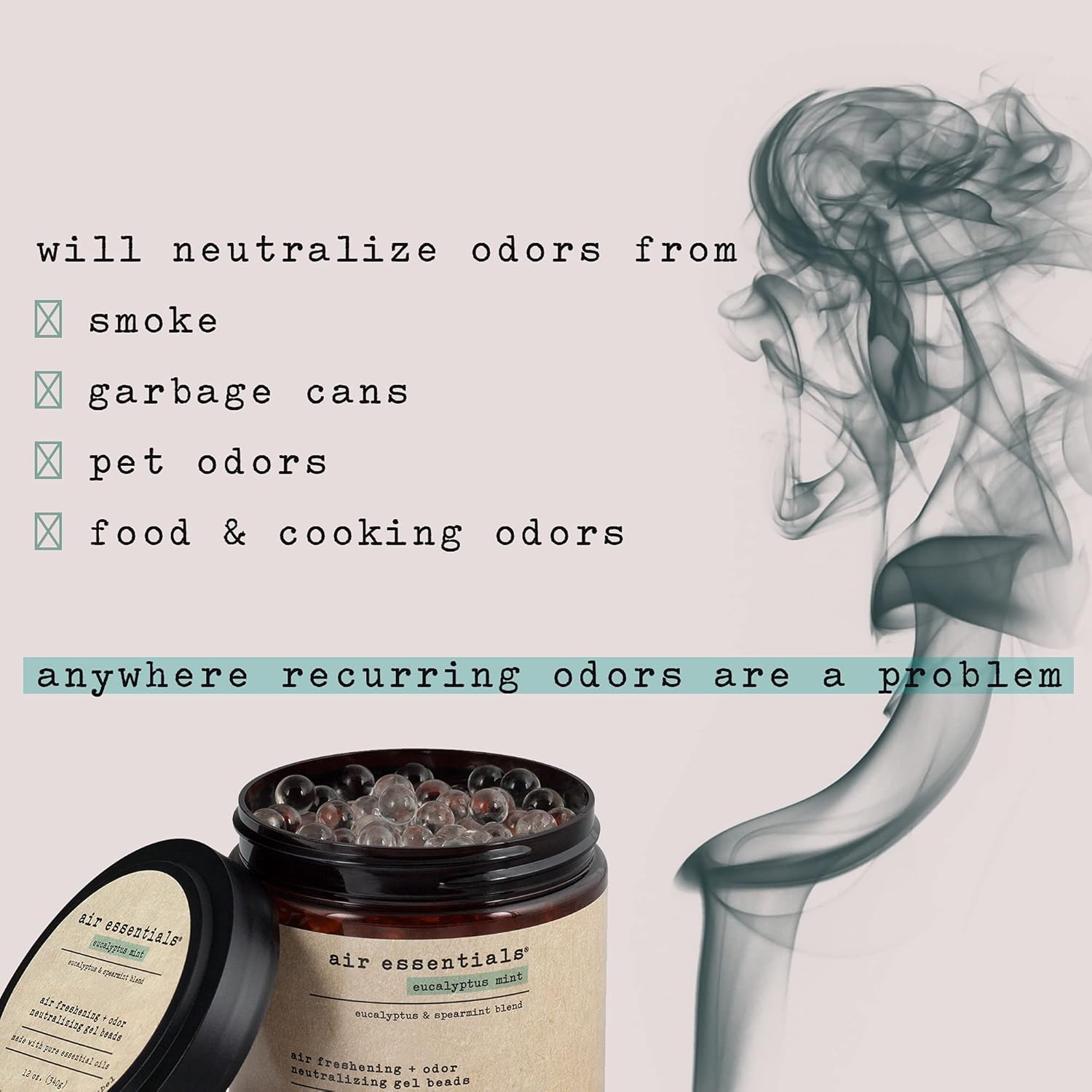 - NEUTRALIZE RECURRING ODORS - Freshen your home, office, car, RV, and boat safely with plant derived ingredients and pure essential oils. Eucalyptus Mint is a blend of eucalyptus and spearmint essential oils. The Gel Beads will neutralize odors from smoke, garbage cans, pet areas, food, cooking and anywhere recurring odors are a problem.