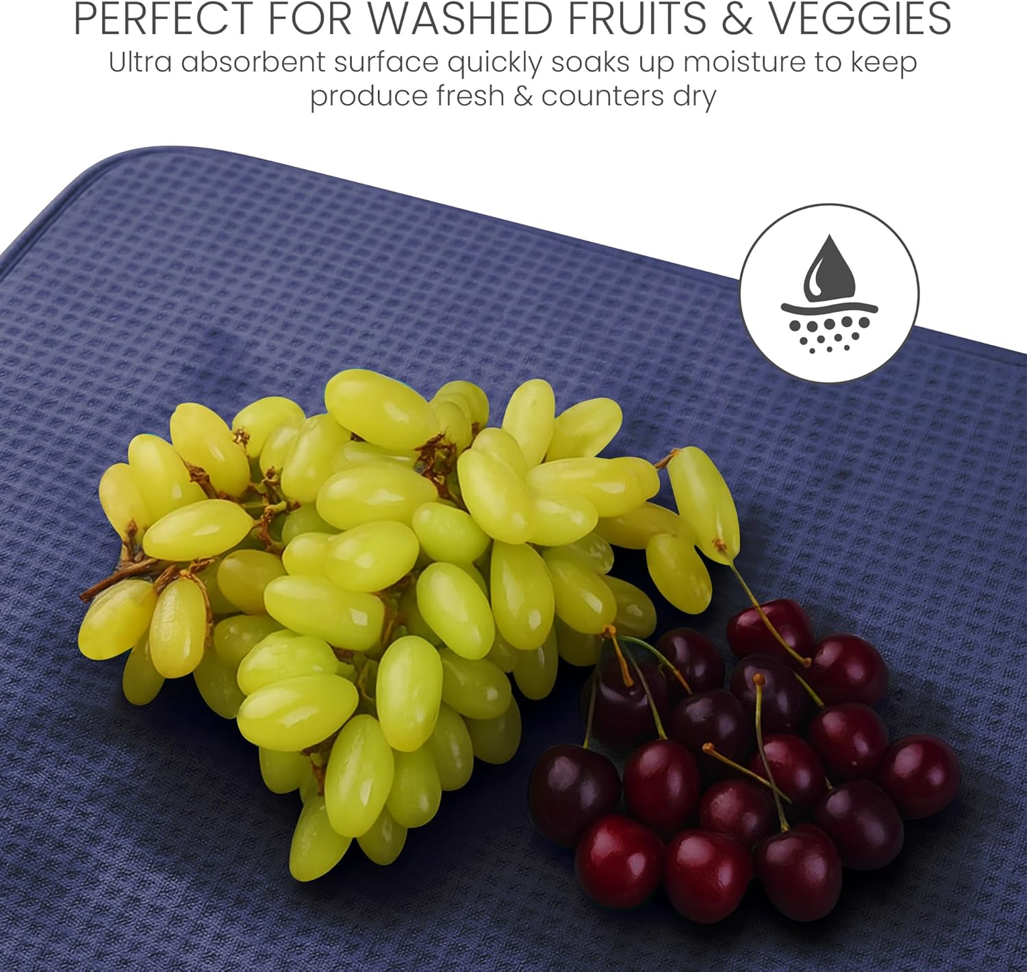 - THICKEST , STYLISH MAT | INNOVATIVE HONEYCOMB WEAVE: Keep your counter spotless even while washing a sink full of dishes . Our superbly stylish drying mat is among the thickest on the market today , and its innovative honeycomb microfiber structure enhances absorption and quickens drying time .