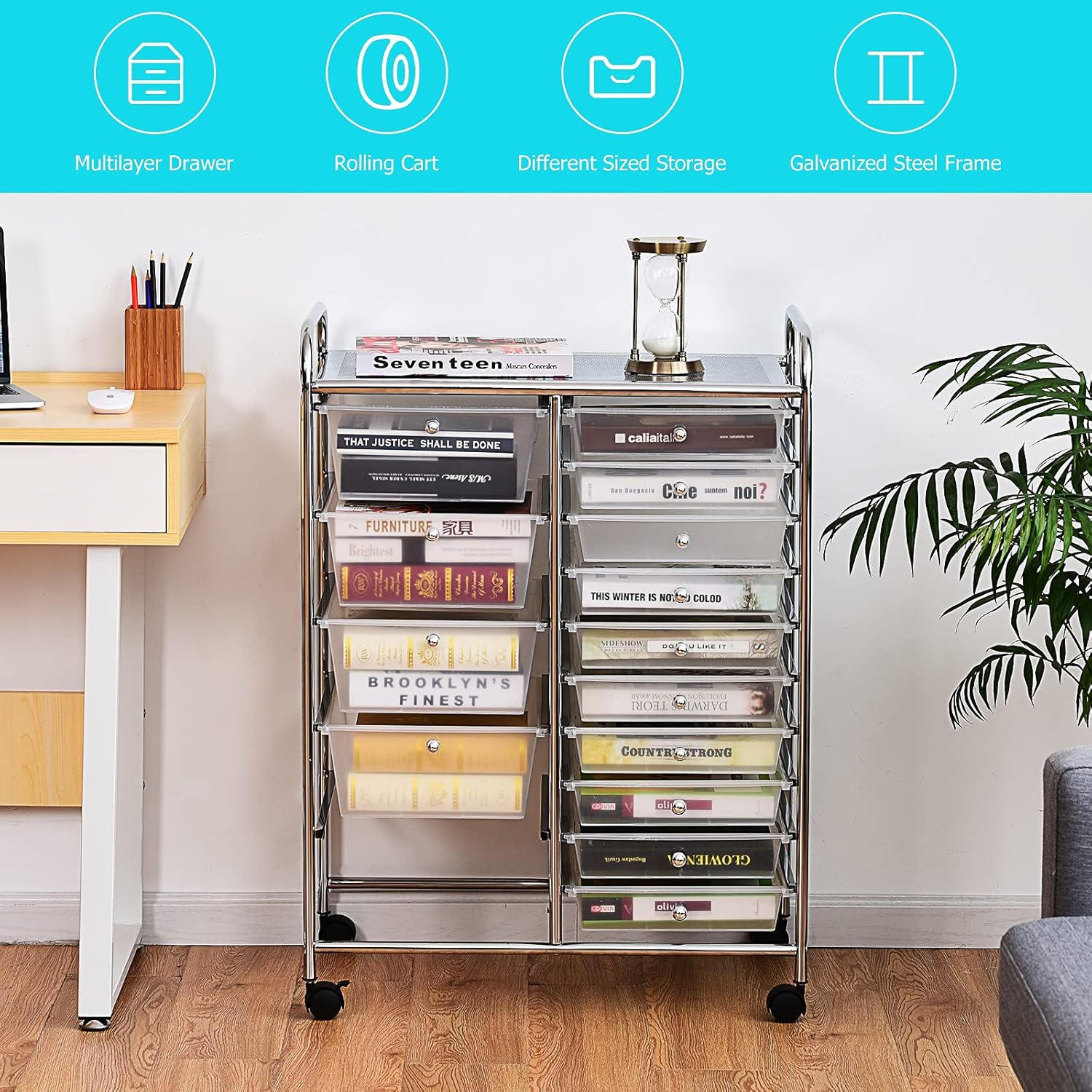 - Versatile & Practical Function: As a good assistant, the rolling storage cart will make your home office supplies tidy and neat. The storage cart with concise style can brighten your space and perfectly combine with your home, office or school.