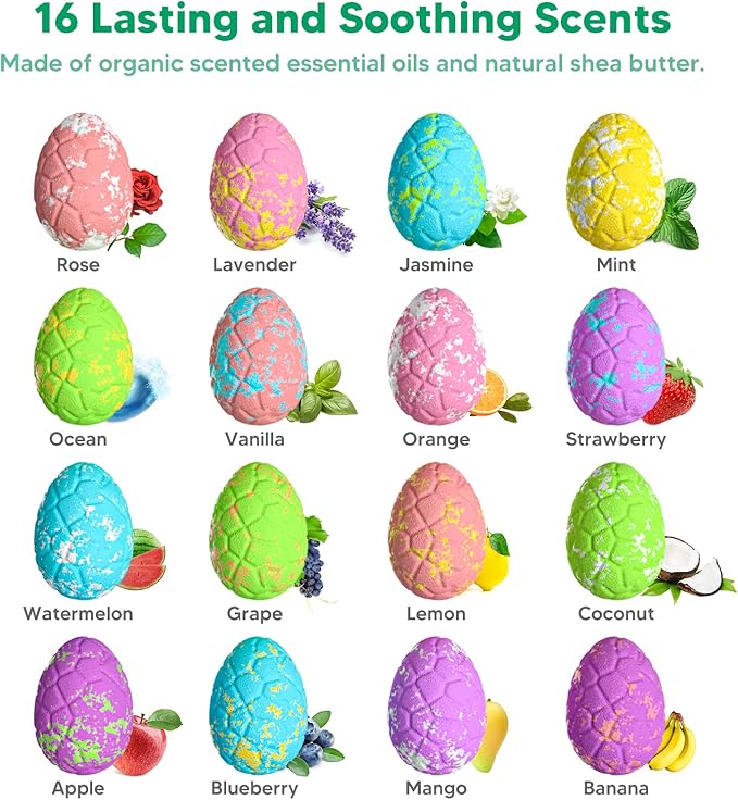 - 【16 Different Bath Bombs Set for Kids】Our bath bombs set contains 16 different individually packaged dino egg bath bombs, each of which has a different color and scent, and also contains 16 different dinosaur toys inside. Once dropped the bath bombs in water, they will float and fizz, giving the water a vibrant color and releasing essential oils aroma. The dinosaur toys also reveal when the bath bomb fizzes out. These bath bombs make bath time fun, no more fighting with kids to take bath!