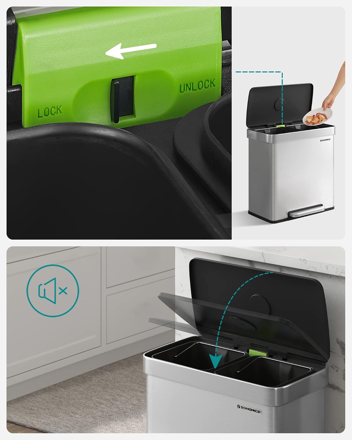- [Dual Compartments & Liners] With two 8-gallon compartments, this dual trash can helps sort normal waste and recyclables in your kitchen; it comes with 15 custom-fit SONGMICS trash bags (code 30A), which are designed to perfectly fit this garbage can