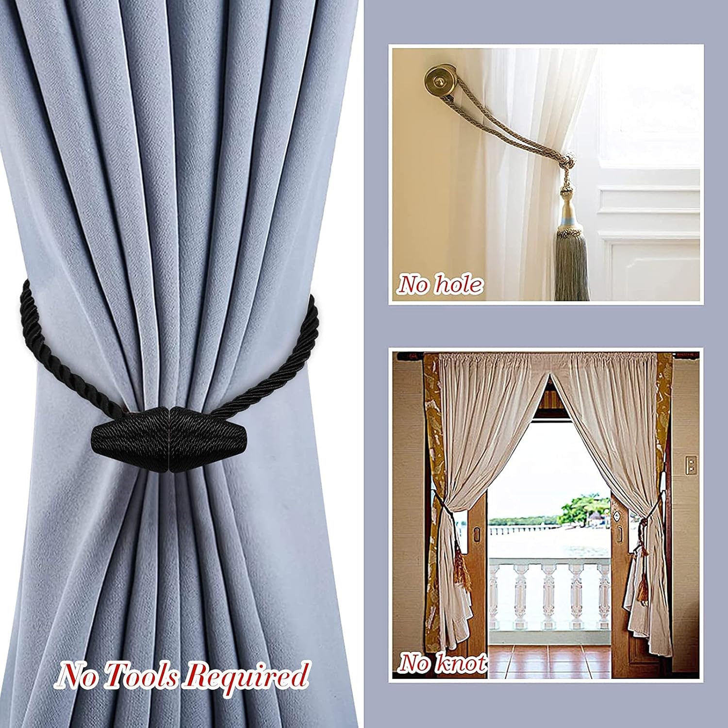 - [Upgrade Powerful Magnetic] Our magnetic curtain tiebacks magnets use high-end new imported nickel-plated magnets, with strong corrosion resistance and durability, more magnetic than ordinary magnetic curtain tiebacks, and do not rust and not lose color. The rope of curtain tie adopts upgrade thickened solid polyester yarn, which is not only durable, but also not easy to wear or pilling.