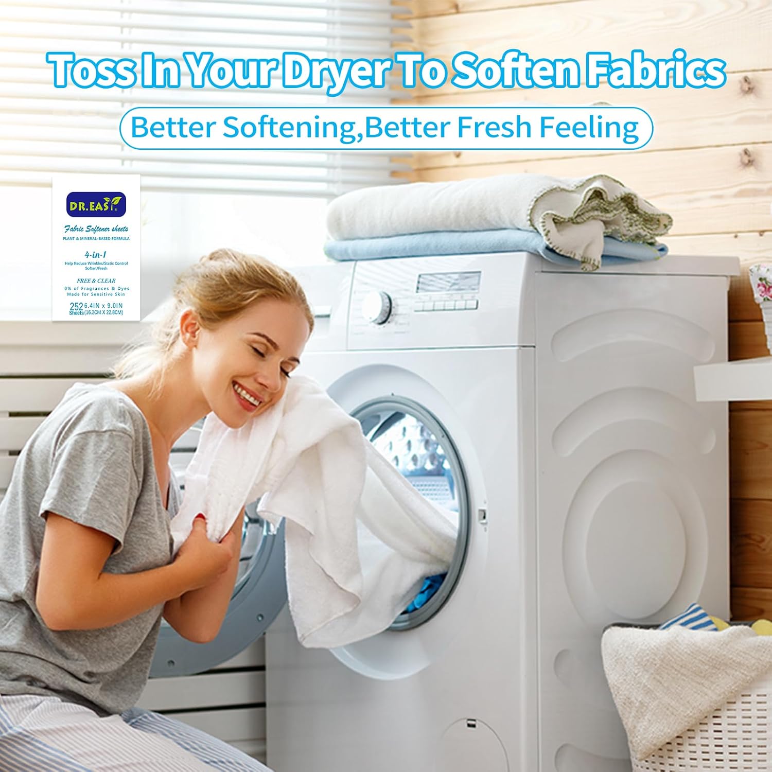DR.EASY Dryer Sheets Plant Based Formula 252 Ct Fabric Softener sheets for Laundry Free & Clear Essential Oil Scented No Artificial Fragrances No Dyes Reduce Static & Wrinkles Help Repel Pet Hair