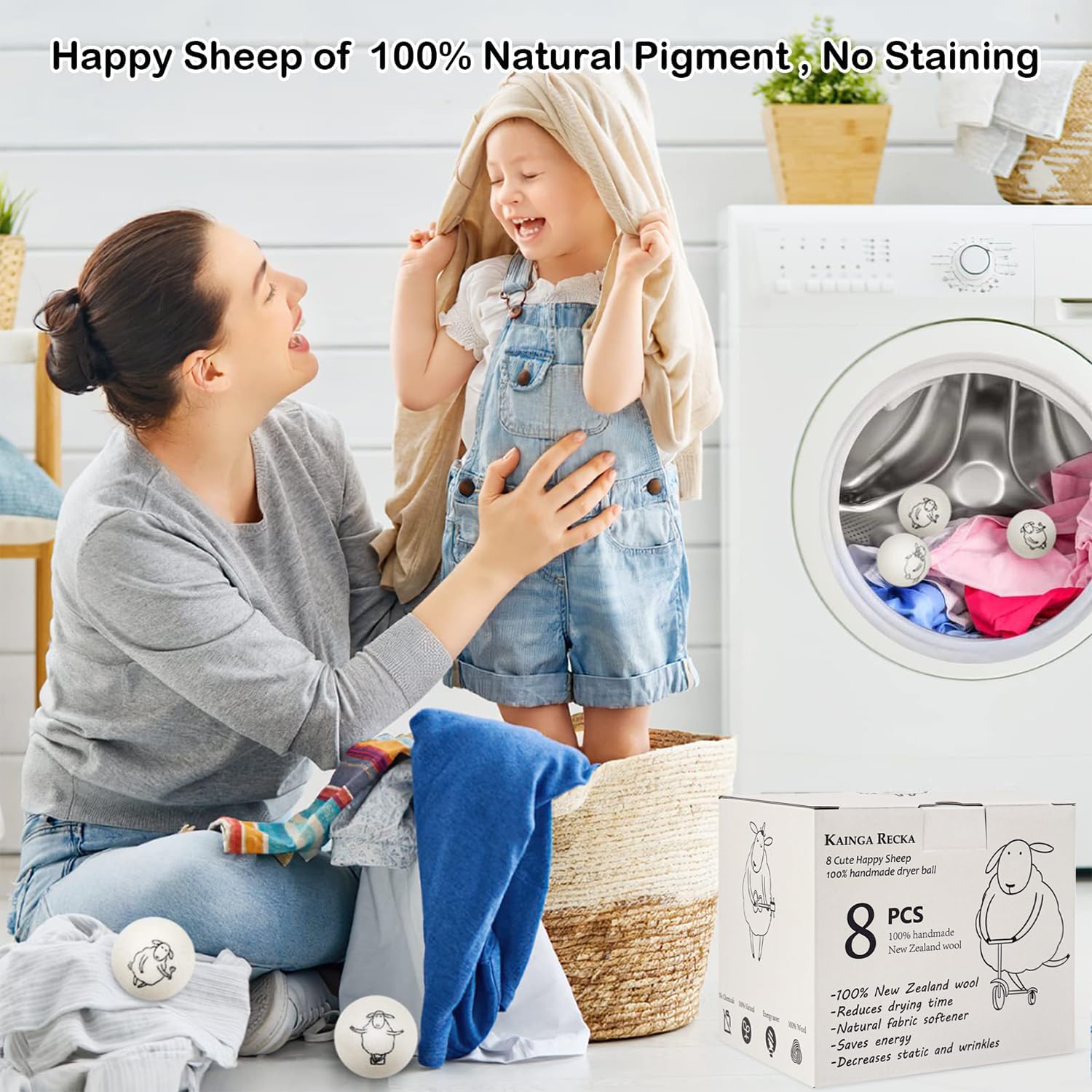 Wool Dryer Balls, 8PCS Dryer Balls with Happy Sheep - Natural & Organic, 100% New Zealand Wool Handmade, Chemical-Free Reusable Laundry Balls, Anti-Static Reduce Wrinkles and Save Time