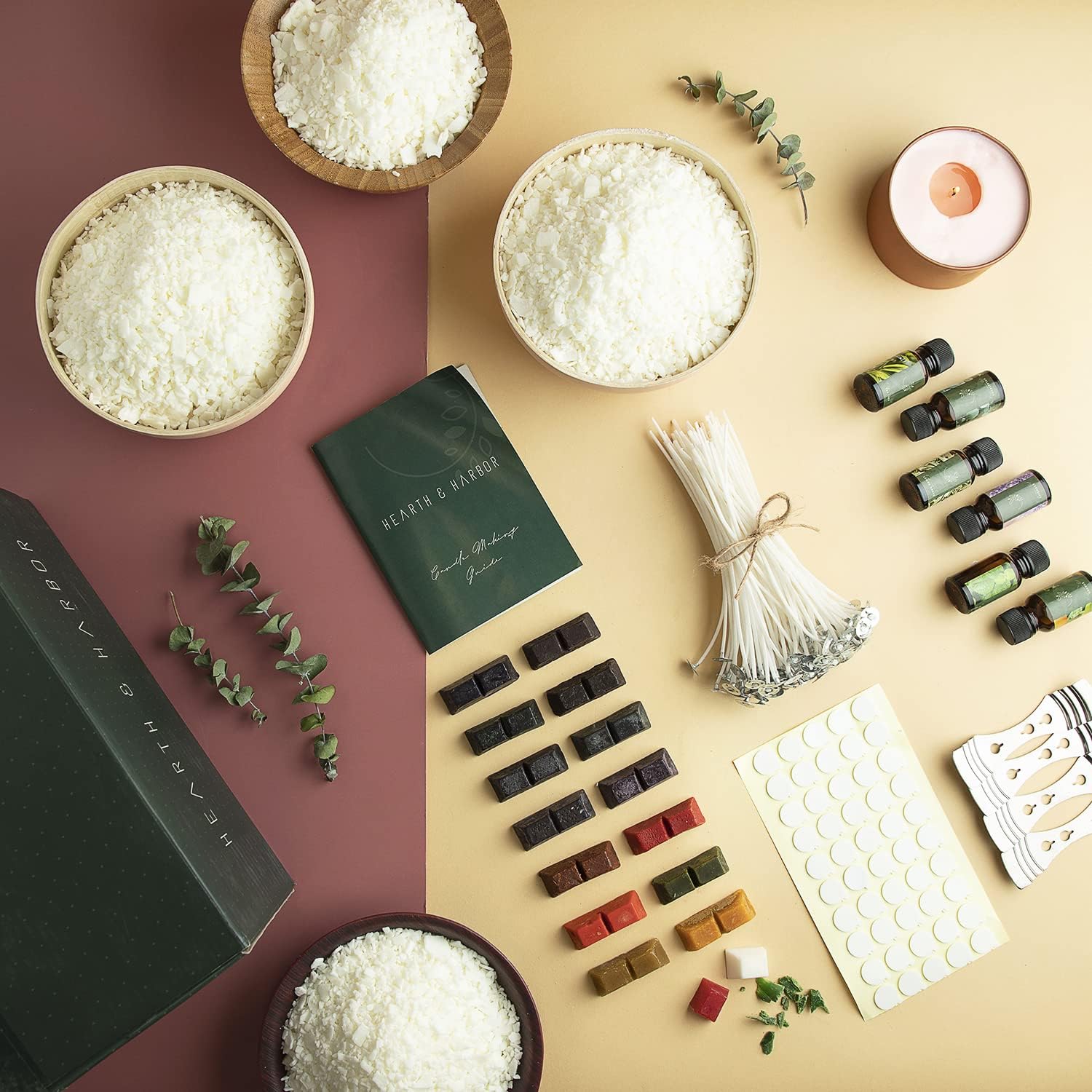 - All-In-One Starter Kit β Everything you need to dive into candle making! Our Hearth and Harbor soy candle wax for candle making includes 10 lb. bag wax, 16 dye blocks, 6 candle scents for candle making, 50 cotton candle wicks for candle making, 50 candle wick stickers, 4 wick holders. Perfect for beginners or seasoned DIYers.