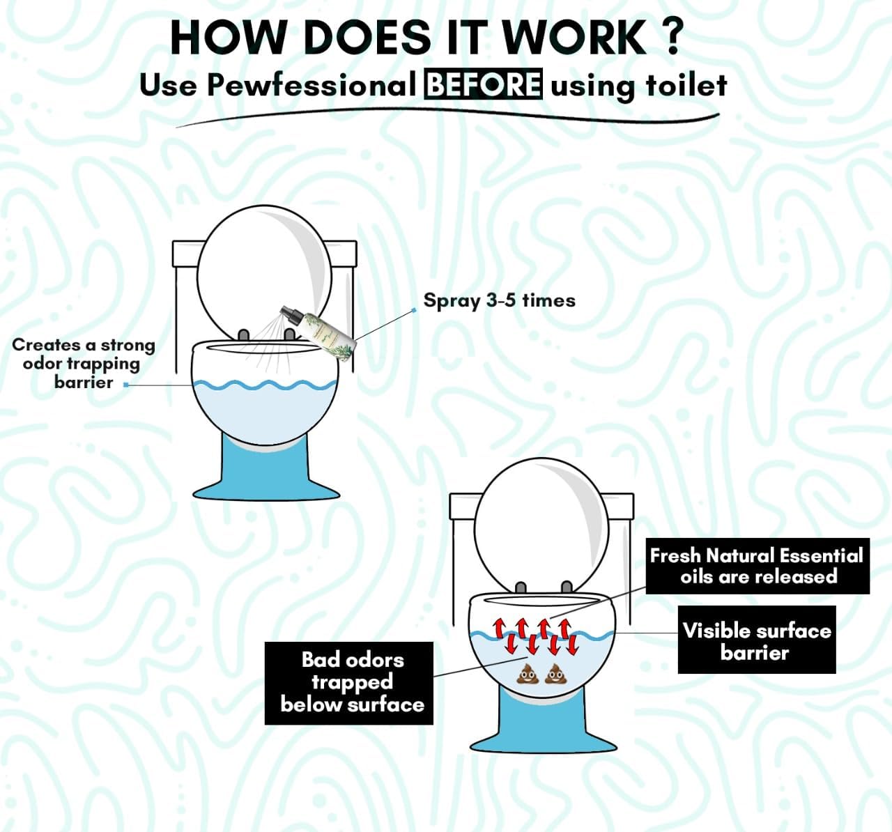 - ACHIEVE FANTASTIC PERSONAL HYGIENE: Pewfessional Poop Spray odor eliminator ensures nasty poo smells stay trapped under the toiletβs water surface. Our proven formula works as a toilet Pooh odor eliminator by creating a strong, visible odor barrier that locks embarrassing toilet odors in the bowl before they can escape.