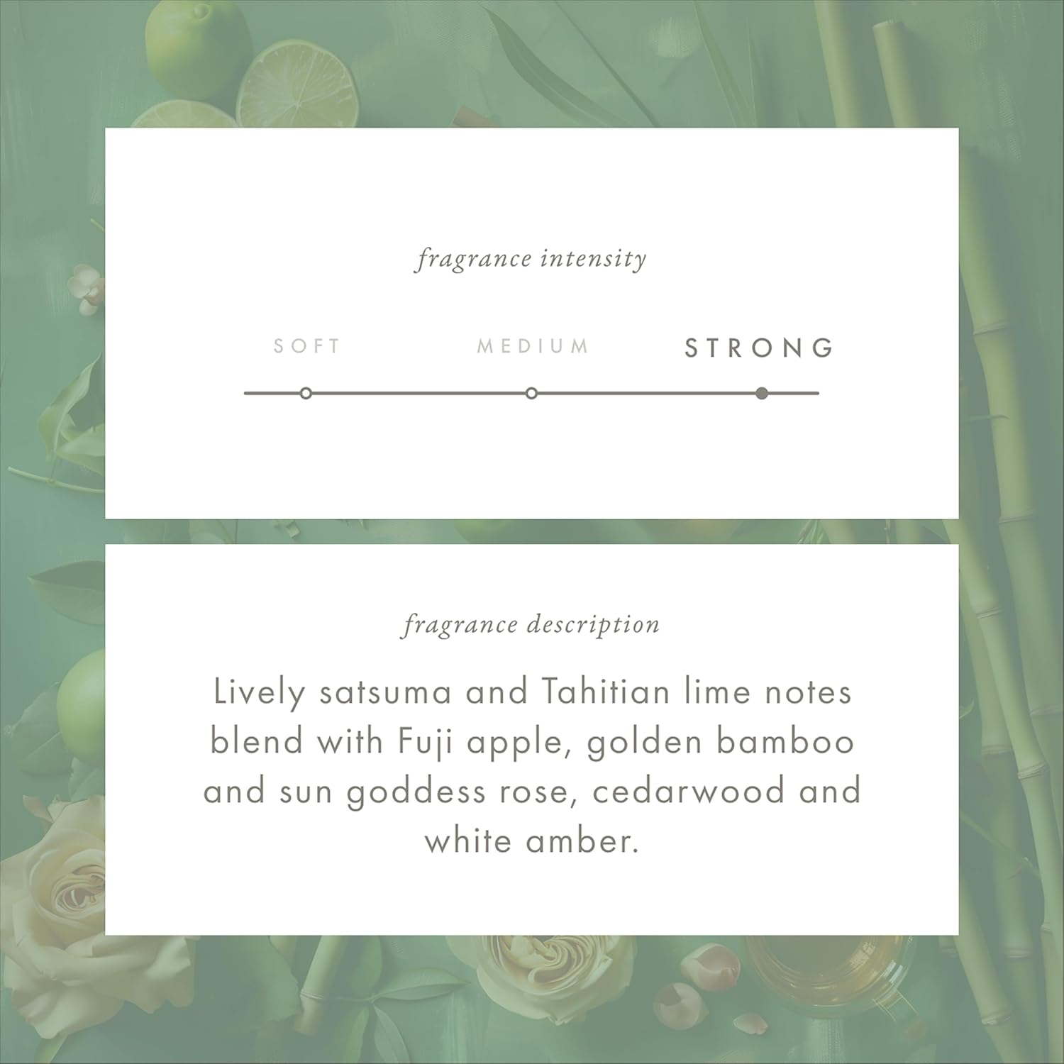 • LOSE YOURSELF IN THE WARM TONES OF SUN-SOAKED BAMBOO AND PERSIAN LIME. Within this medley of citrus, sweet fruits, and florals, lively satsuma mandarin and Tahitian lime mingle with Fuji apples and golden rose. Notes of cedarwood and white amber bring an earthy musk, balancing the bright citrus for an intoxicating fragrance journey.
