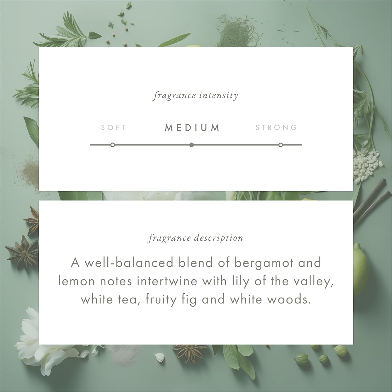 • DRINK IN THE AMBROSIAL BLEND OF WHITE TEA & FIG. Delicately sweet white tea brings aromas of floral jasmine and lily of the valley as a hint of bright, juicy lemon invigorates the senses. Fresh, honeyed fig lends earthy, nutty notes that are rich with warm current, amber, and musk. It’s a heavenly fragrance, infusing the world with balance and beauty.