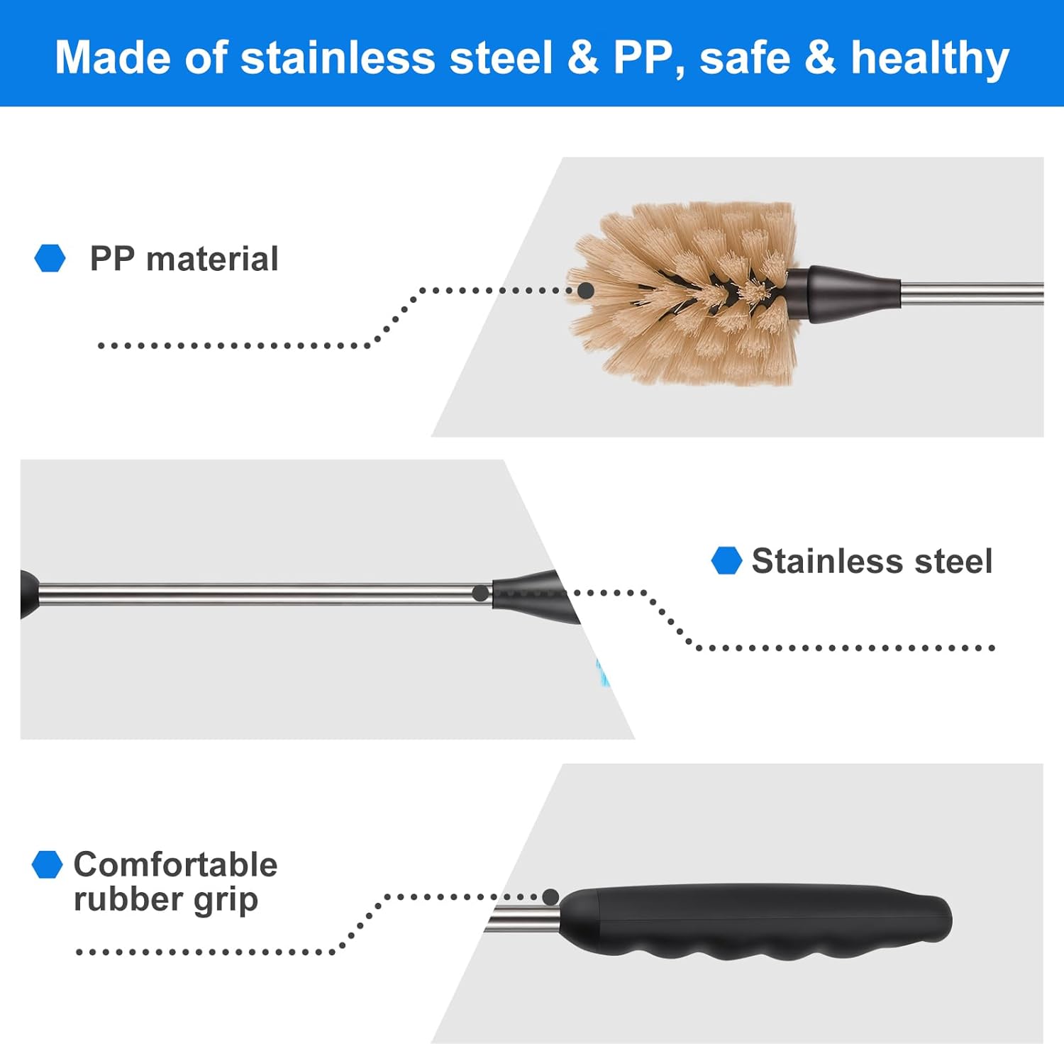 • PREMIUM QUALITY BRUSH: The water bottle cleaning brush is made of premium stainless steel and high-quality nylon material, which is comfortable and flexible, odorless and safe, and won't leave scratches on your water bottle.