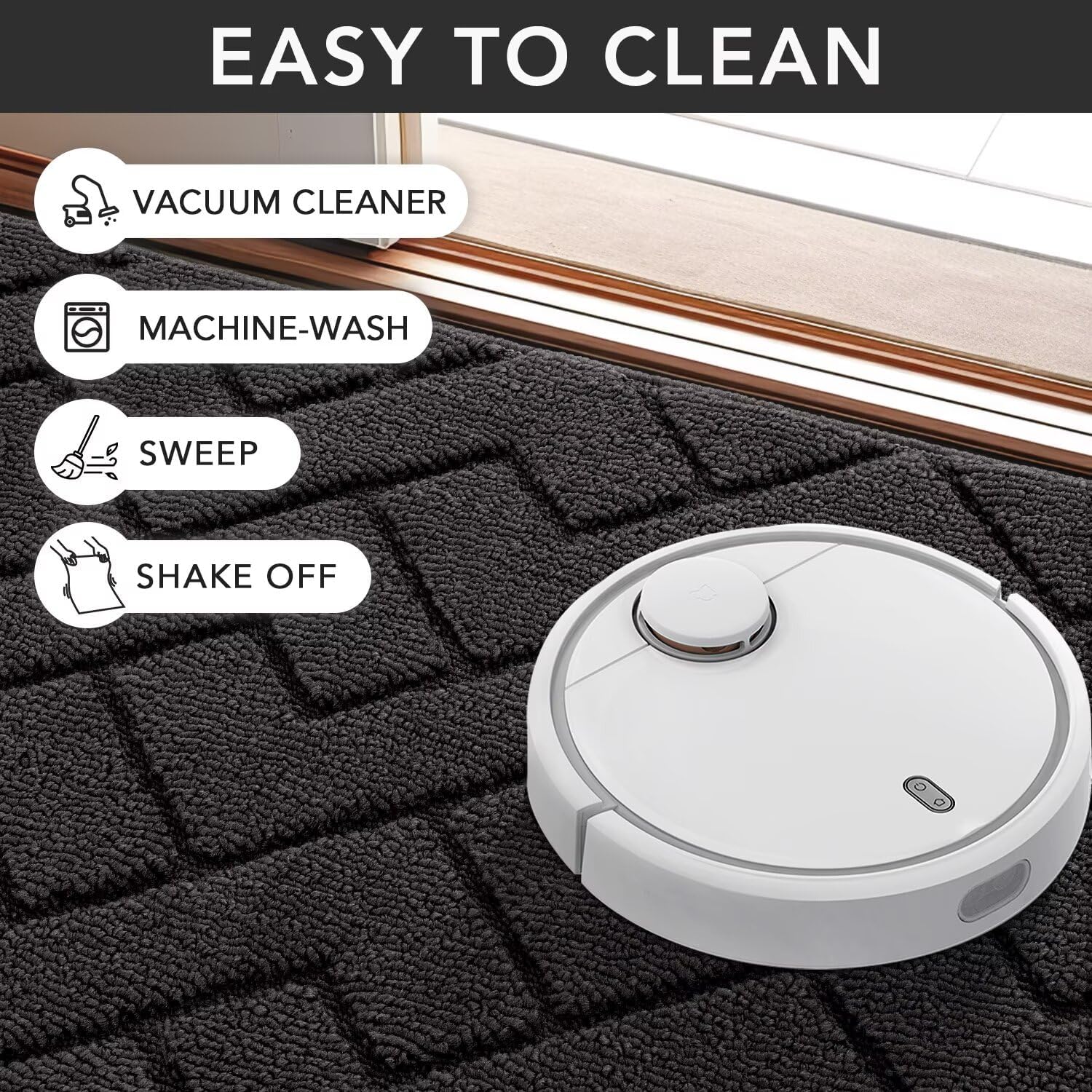 - EASY TO CLEAN: The unique rib fabric design removes dirt from shoes easily. When your doormat gets dirty, first shake it off outdoors or over your garbage bins, then sweep with a broom or vacuum regularly or use a garden hose to rinse the mat outdoors. For deeper clean: machine washable, use water under 86 (β) / 30 (β). Do not iron. Do not bleach. Do not expose it to the sun for a long time.