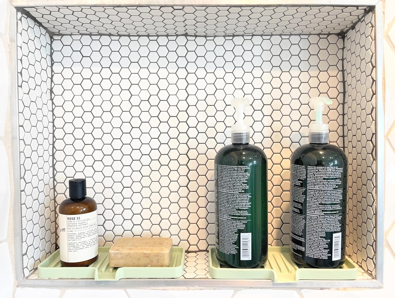 - A More Hygienic Home | A dedicated space for your dishwashing supplies, bathroom sink items, shower niche/shelf items. Tray and drain chute are slightly sloped to help funnel excess water away. Thick, sturdy base stays in place without suction while raised lines promote air flow, so items dry faster and are less prone to developing nasty odors.