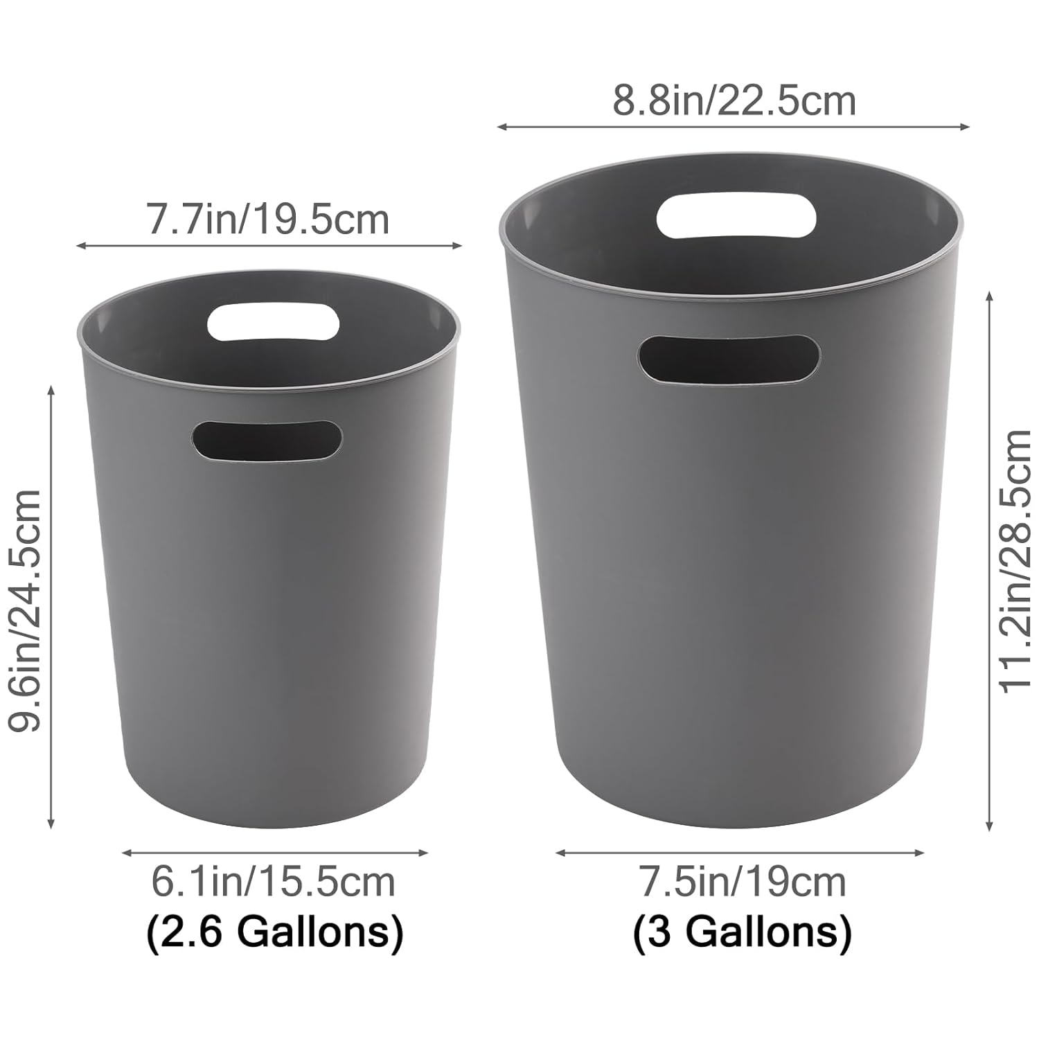 - SPECIFICATION: There are two size of the bathroom plastic waste basket, 2.6 gallon/ 10 liter capacity and 3 gallon/ 12 liter capacity. Our wastebasket is suitable for your needs. Use it for small trash, recycling cans, paper waste and junk mail for the office, or cotton, cleansing pads, cotton swabs and more in the bathroom.