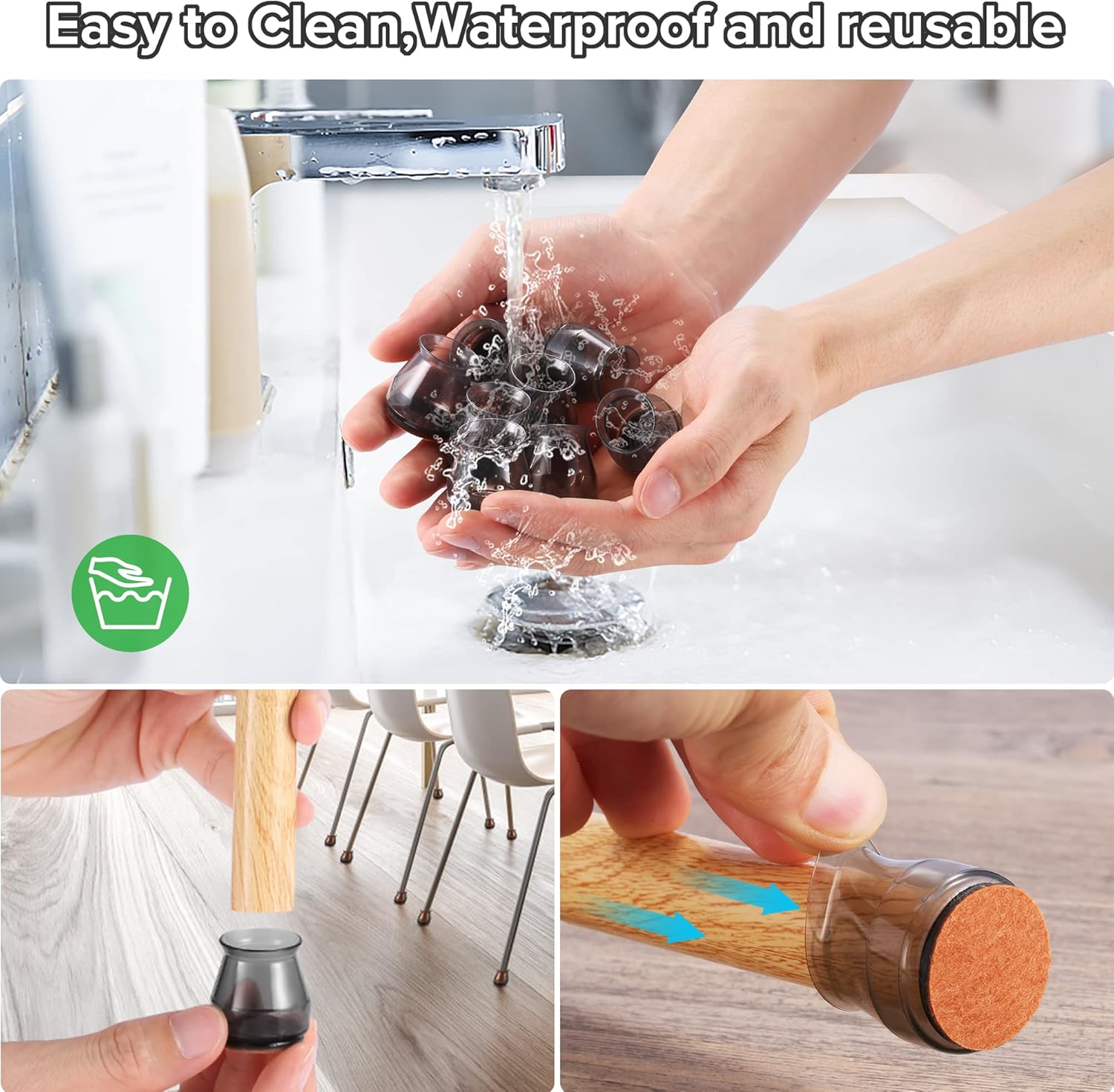 • ✅【Latest Upgrade】Compared with most of the traditional 1mm furniture pads on the market, our chair leg floor protectors are made of 2mm thick silicone, which will never be damaged, durable. The chair leg protectors will not change color when stretched. Inside of the inner sleeves are particles with anti-slip, which will firmly fix the chair and never make the covers fall off. Felt pads at the bottom make your furniture move silently and smoothly along floors without leaving marks and noise.