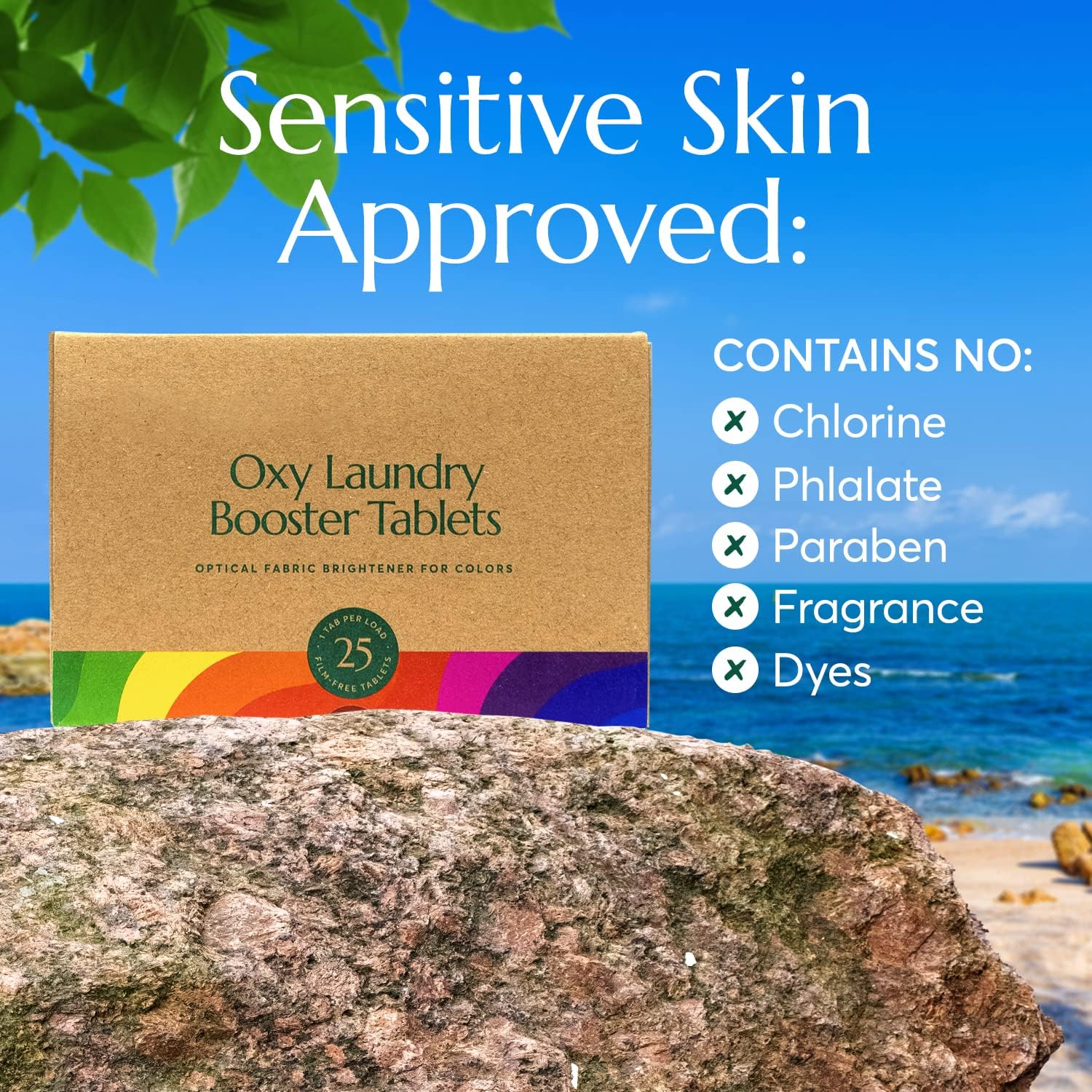 - First, add one Oxy Laundry Booster Tablet into your washer, then add clothes and Earthwash or your favorite detergent. Finally, wash as normal and enjoy your revived and brightened wardrobe with our laundry whitener brightener!