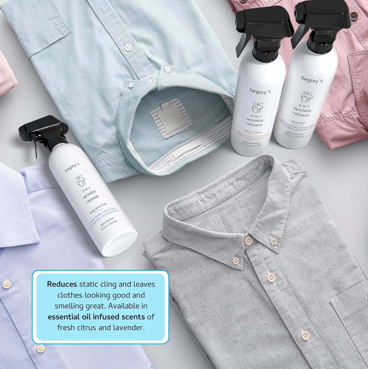 Begley's 3-in-1 Wrinkle Remover, Quick Fix Wrinkle Release, Static Cling Remover, Odor Eliminator and Fabric Refresher Spray - USDA Certified Biobased - Lavender, 3 oz Travel Size
