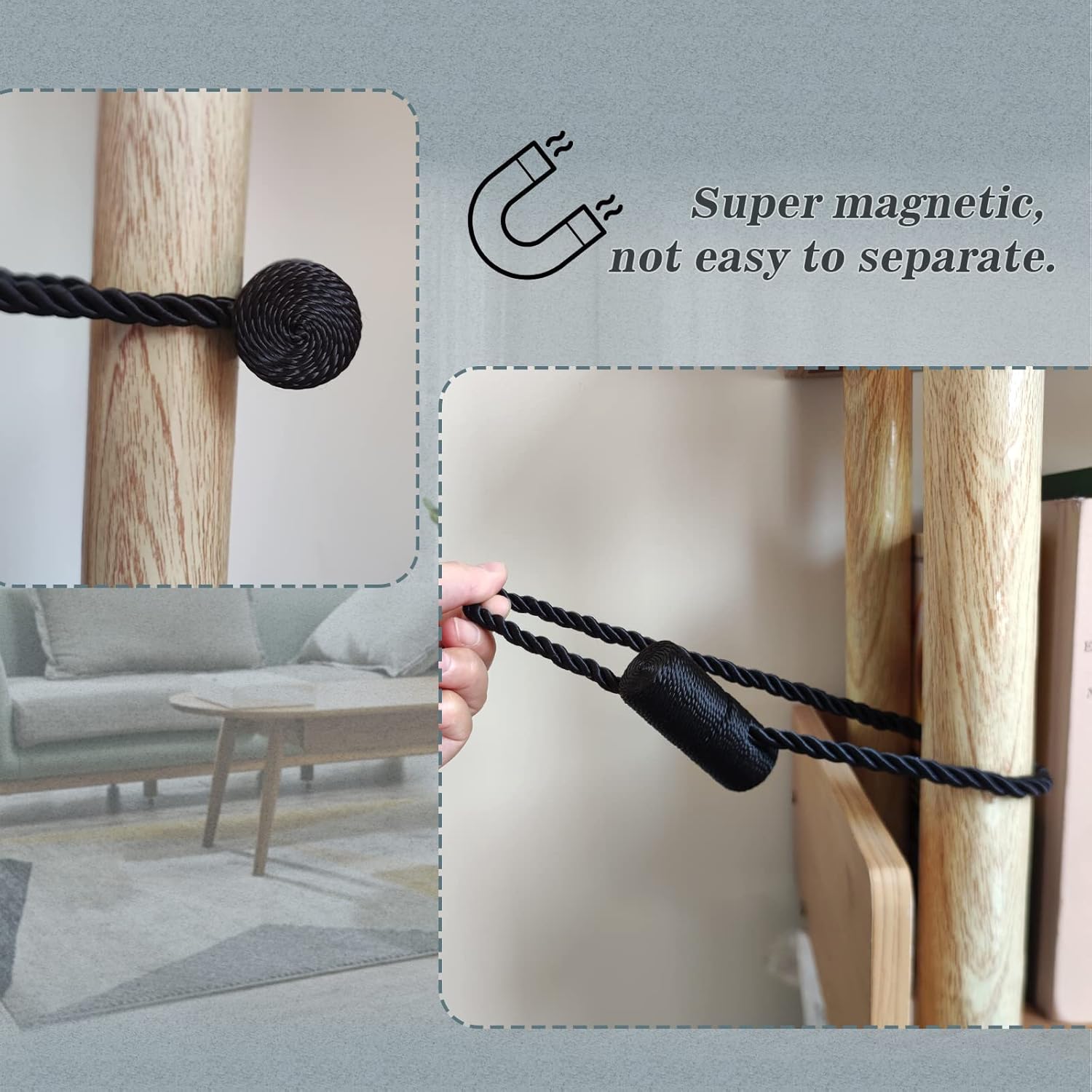 - [Upgrade Powerful Magnetic] Our magnetic curtain tiebacks magnets use high-end new imported nickel-plated magnets, with strong corrosion resistance and durability, more magnetic than ordinary magnetic curtain tiebacks, and do not rust and not lose color. The rope of curtain tie adopts upgrade thickened solid polyester yarn, which is not only durable, but also not easy to wear or pilling.