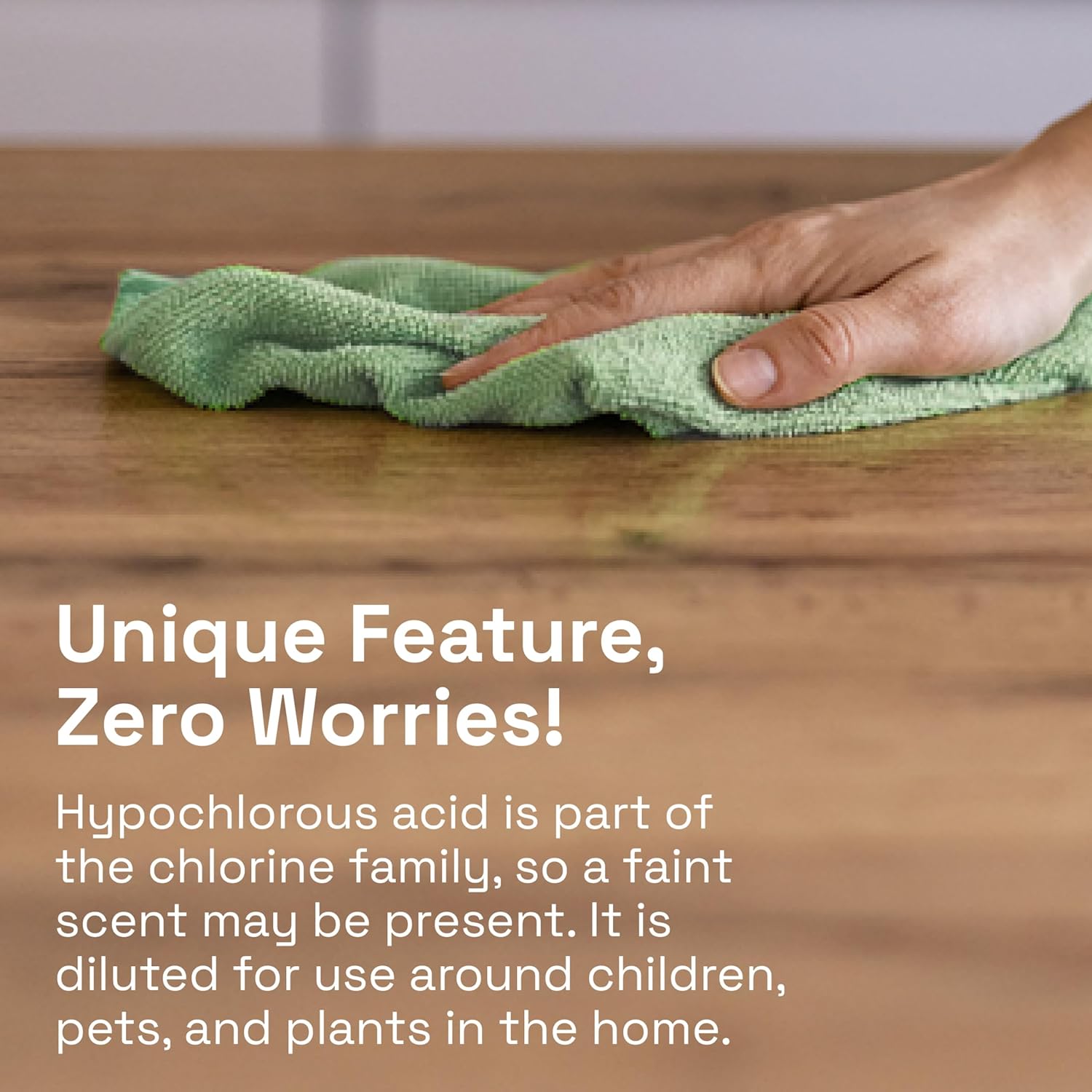 - Unique Feature: Hypochlorous acid is a part of the chlorine family, so there may be a faint scent. The hypochlorous acid is diluted for use around the home with children, pets, and plants