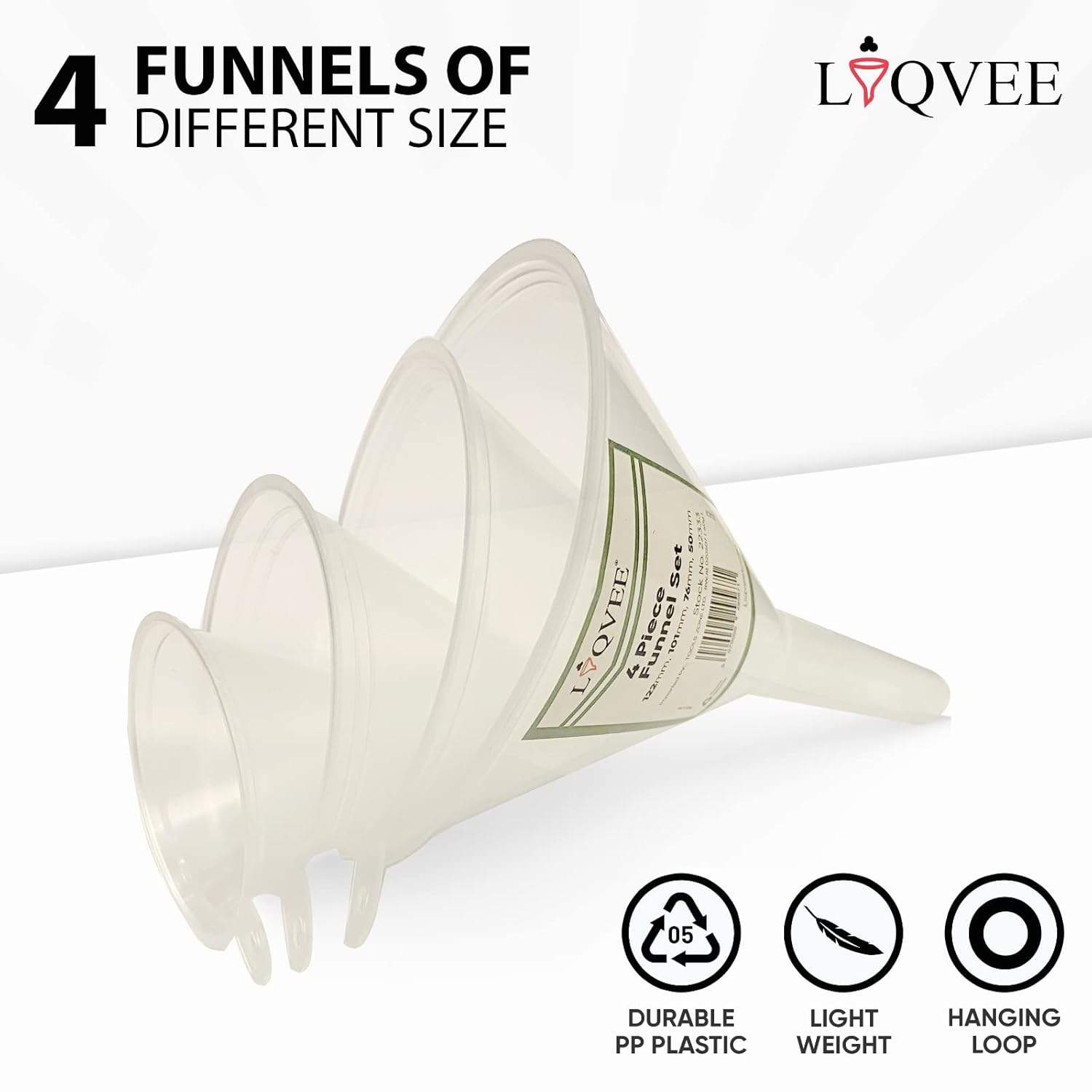 - 4 Funnels in One: Our plastic funnel set comes in a pack of different sizes to fit various applications. The extra-large funnel measures 120mm, the large one is 100mm, the medium 75mm, and the small funnel is 50mm. Each size has its specific function.