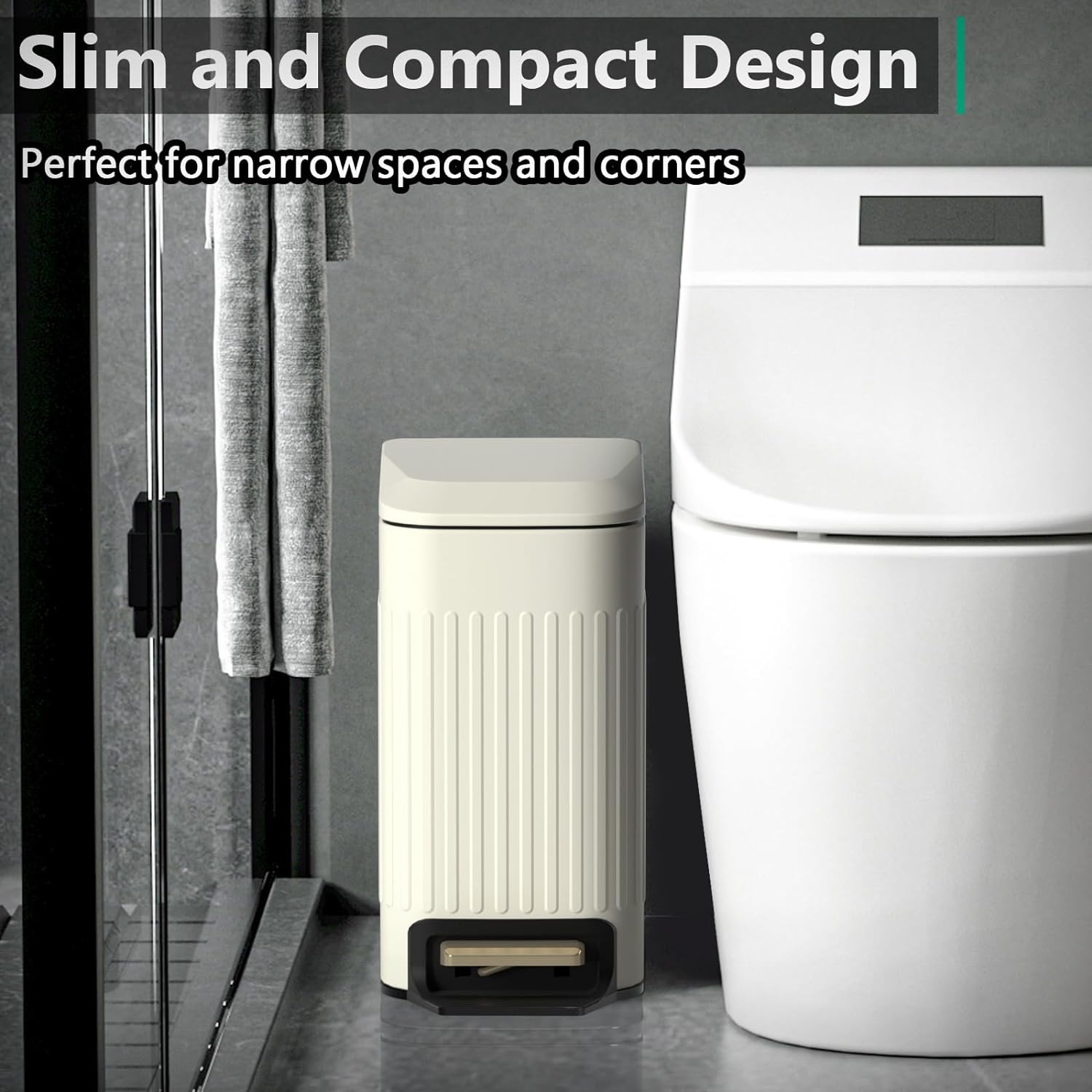 - Slim Design: The rectangular trash can is the perfect size for inside cabinets, under counters, under sinks, and other small narrow spaces; such as bathroom, bedroom, office, toilet, kids room, powder room, farmhouse, apartments, campers, RVs, dorm rooms, etc