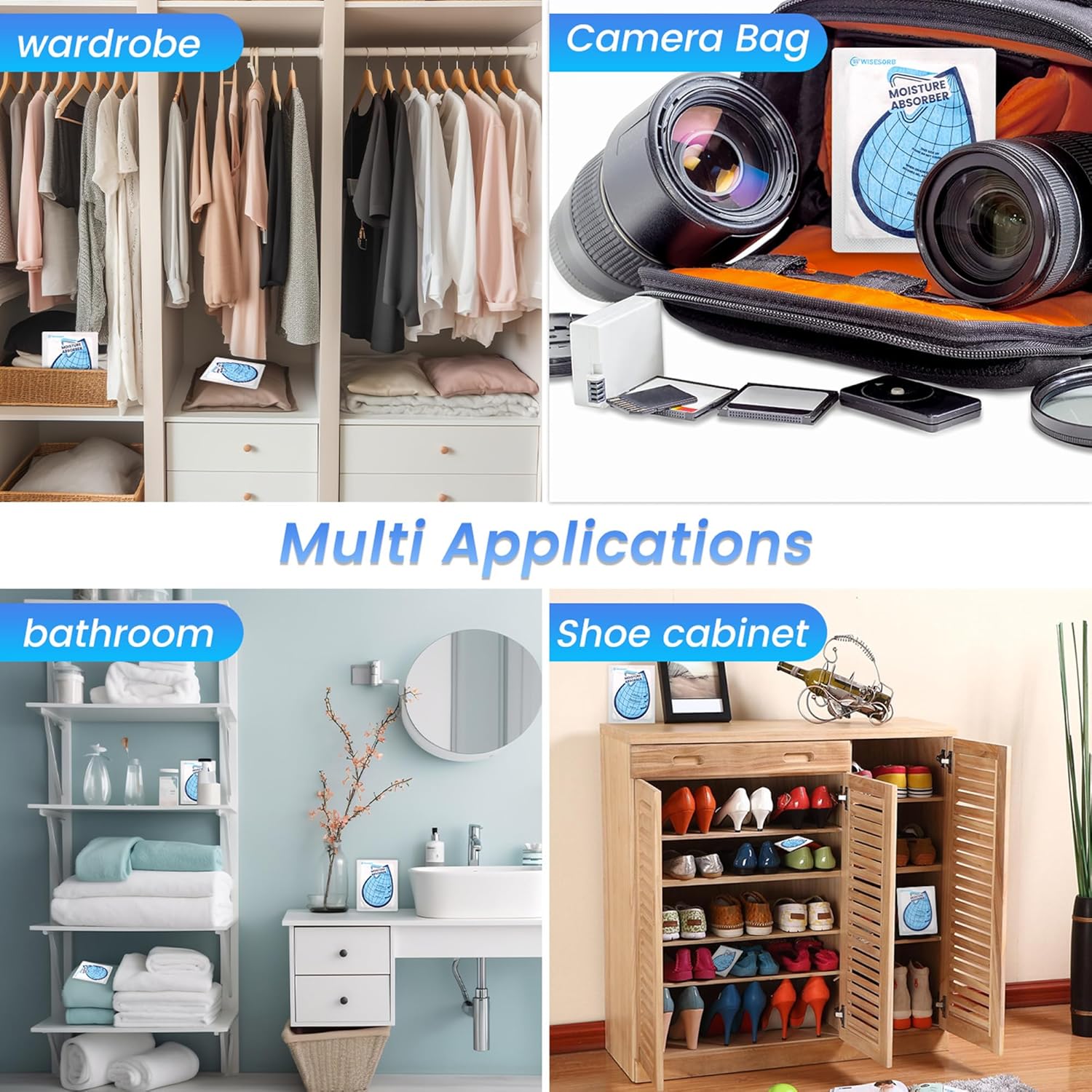 - 【Versatile Usage】: Moisture absorber packets can be used in various locations, including closets, wardrobes, basements, laundry rooms, households, bathrooms, kitchens, shoe cabinets, cars, cat litter boxes, toolboxes, RVs, campers, and other enclosed spaces. These moisture absorber bags effectively protect your valuables from damage caused by excess moisture and prevent smells. Remember to keep the paper side facing up for optimal performance.