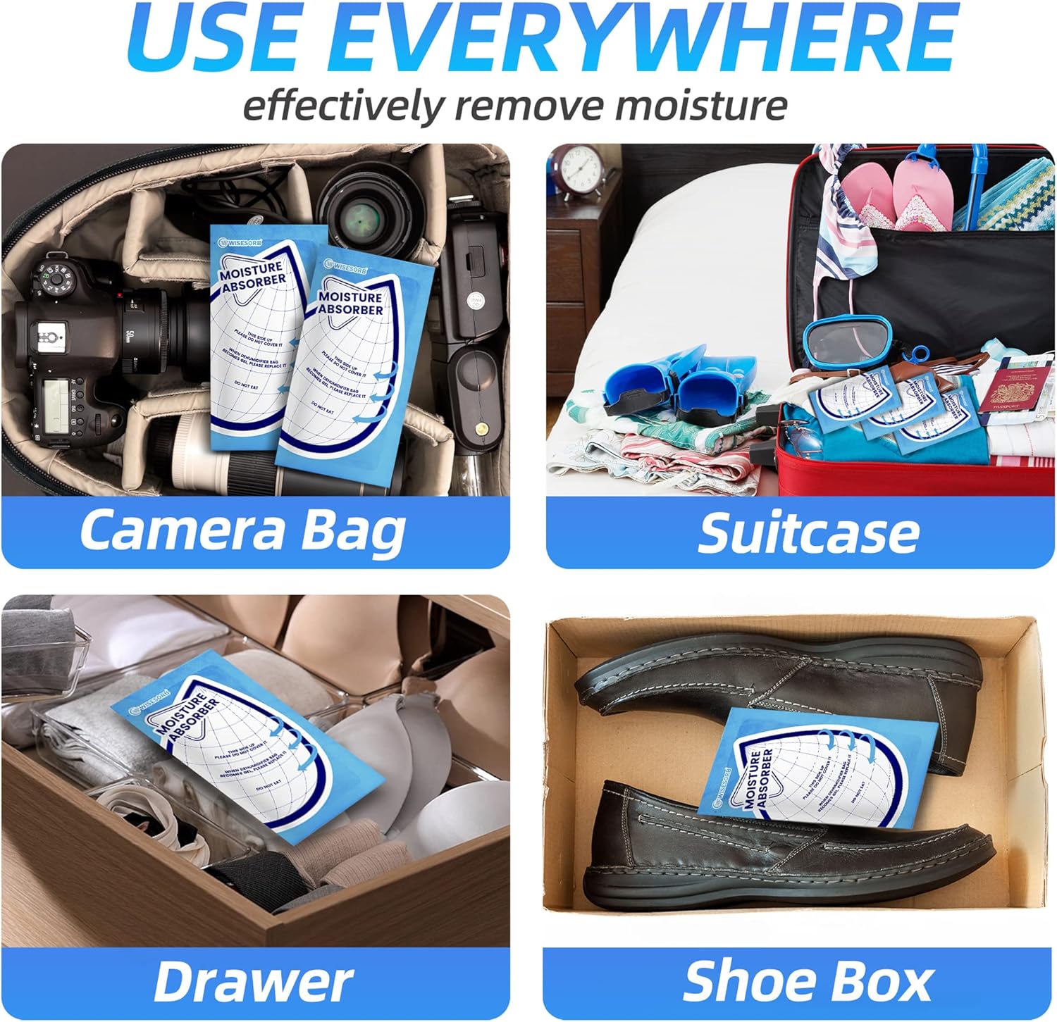- 【Space-Saving】: Wisesorb moisture absorber bags are designed to save space, making them incredibly easy to use. Simply place them in the desired area without occupying much space. Placing them paper side up as instructed to observe the beads turning into gel, offering a visual confirmation of moisture absorption. The result is preserved crispness in clothes and the elimination of musty odors, making Wisesorb bags a reliable choice.