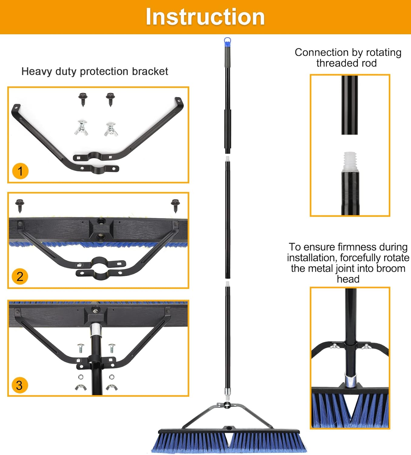 - Included Components : 24 inches broom head,3 section handle, heavy duty holding branket