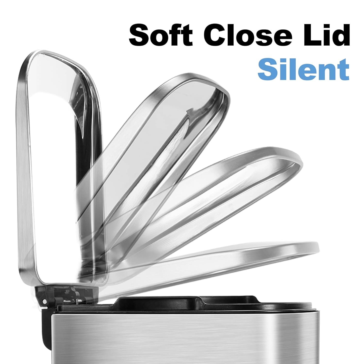 - Nice Soft Close: This trash bin is silent when it closes due to its 'no slam' lid that catches itself and closes slowly. Push the lid at 90° to stay open as long as you need