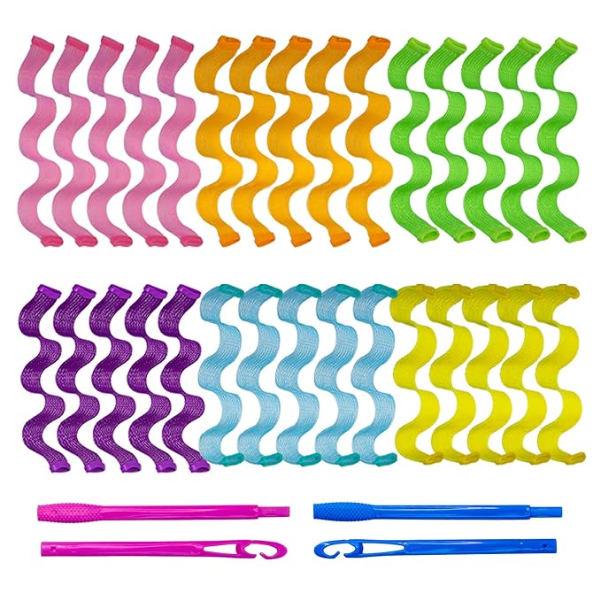 - Package includes: 30pcs wave style hair curlers.pink orange blue green yellow and purple color, 2 sets of hair hooks (blue + pink).