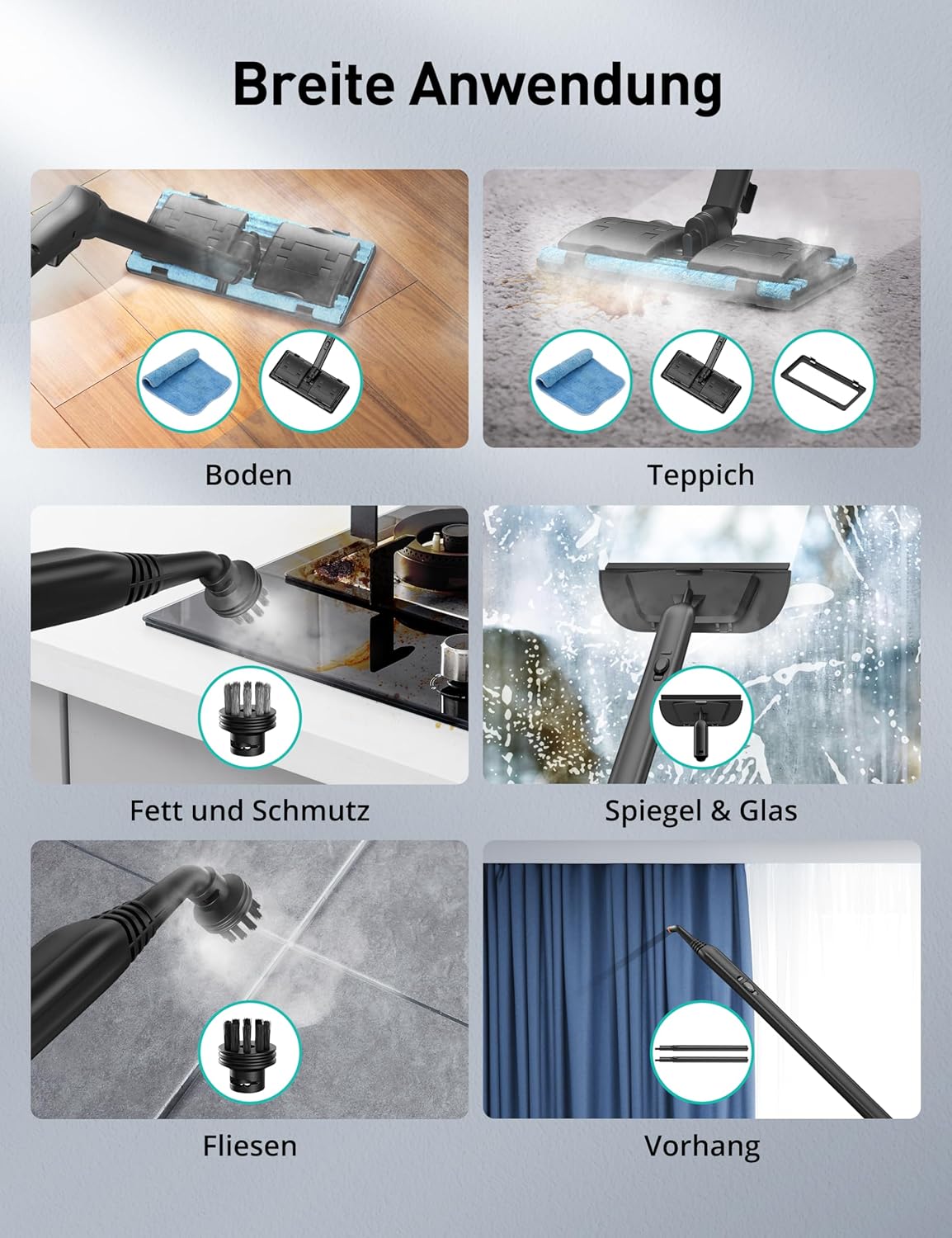 - 【21 Versatile Accessories】 The steam cleaner for car and home use Including a floor brush, an ironing brush, a glass brush, 3 Nylon round brushes, 3 stainless steel brushes, 2 extension tubes, a big nozzle, a towel floor brush, an ironing towel, a carpet glider, a pair of gloves, a squeegee, a measuring cup, a funnel, a piece of cleaning wipe, and a storage bag, this carpet steam cleaner handles different cleaning tasks and is perfect for car, office, bedroom and home use