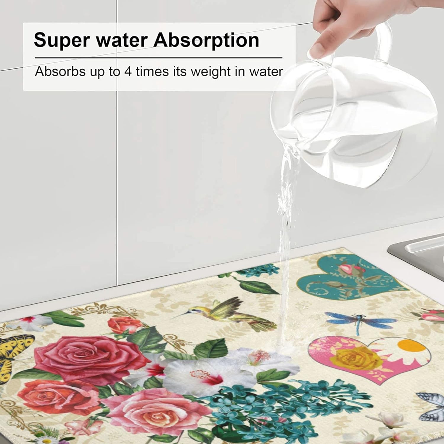 Dish Drying Mat For Kitchen Counter Absorbent Dish Mat Reversible Drainer Drying Kitchen Mat (Beautiful Boho Flowers, 24X18)