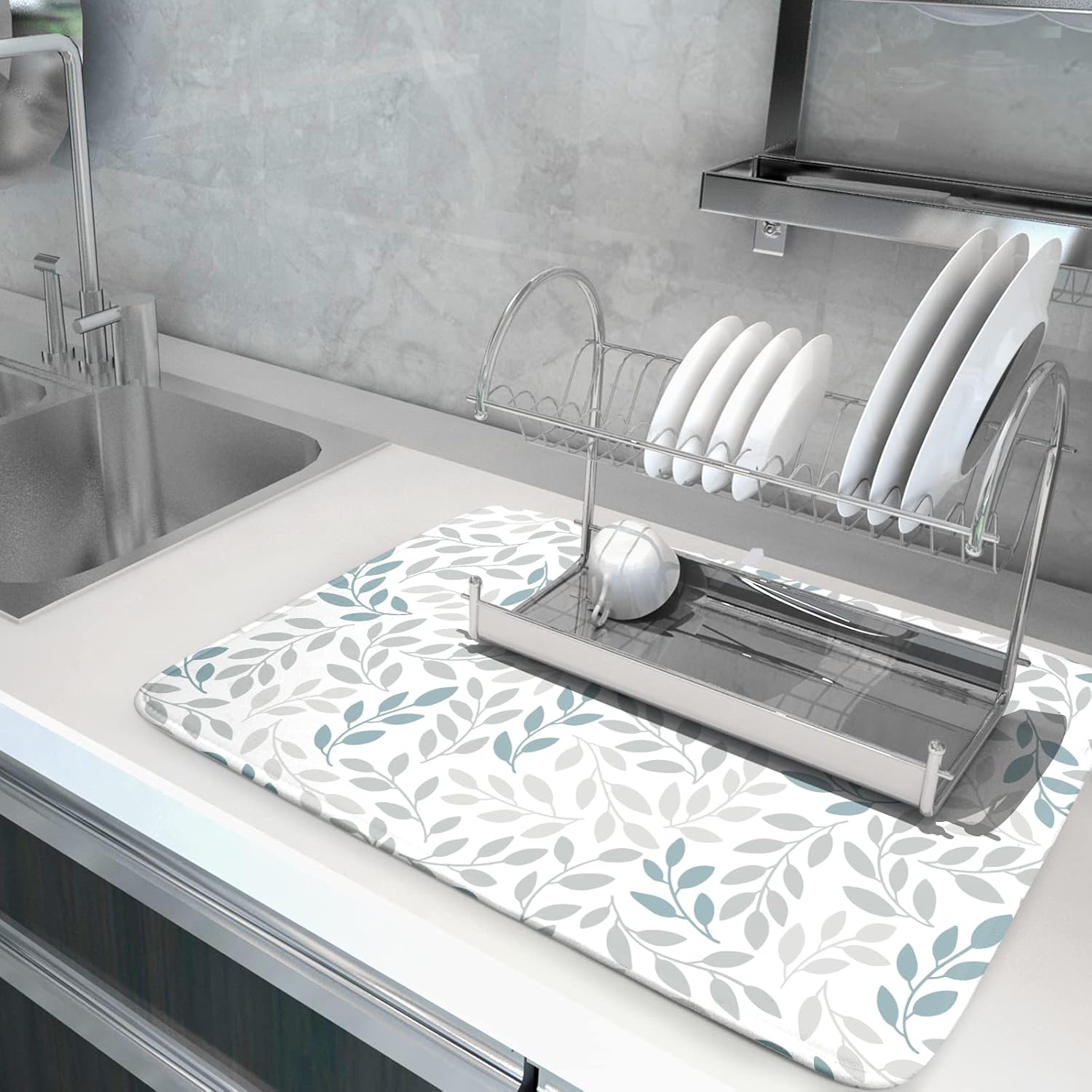 Dish Drying Mats for Kitchen Counter 16x18inch,Grey and Blue Leaves branches Dish Drying Mat for Kitchen Dishes Pad Dish Drainer Rack Mats Absorbent Fast Dry Kitchen Accessories